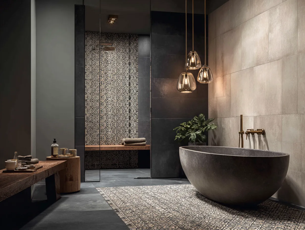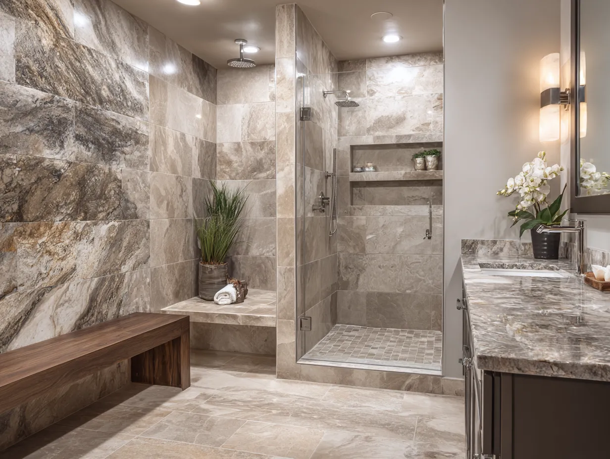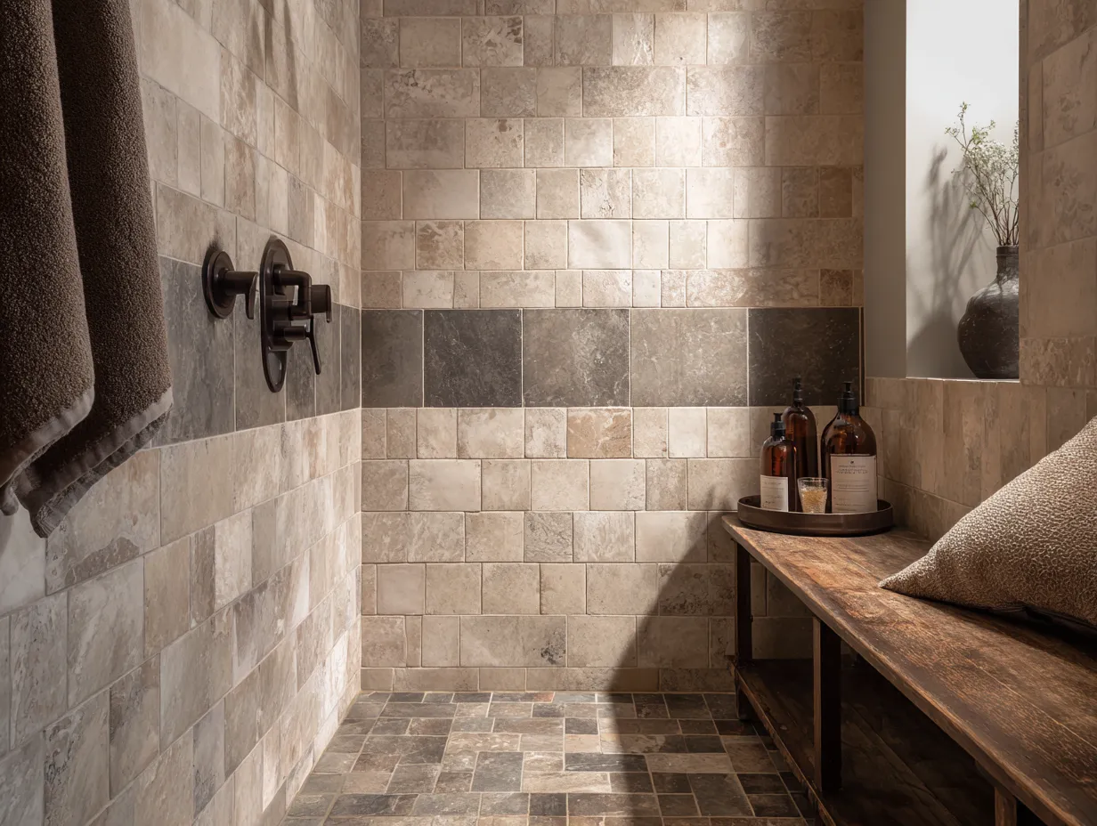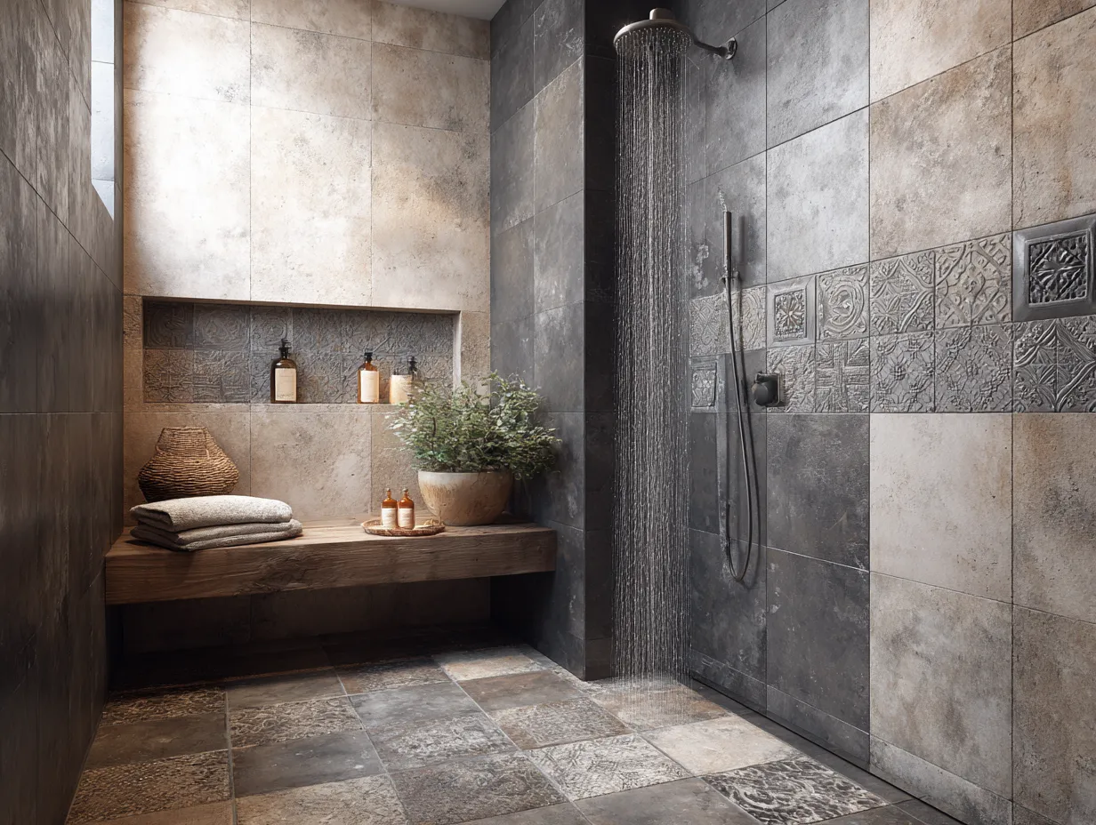 Shower Tile Ideas with Beige Terrazzo and Charcoal Geometric Accents