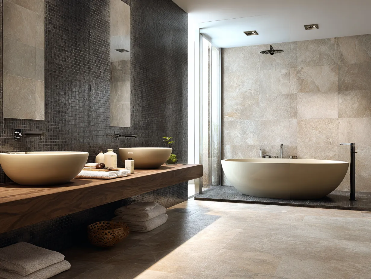 With beige and charcoal, the success lies in harmony. Each tone brings out the beauty of the other, offering balance and calm. This is an ideal combination for anyone looking to create a spa-like space with just the right amount of contrast.