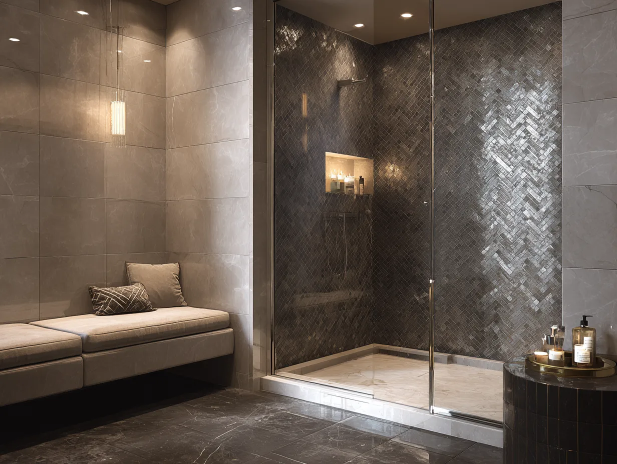 Consider using slightly varied tones of beige in the chevron to mimic natural stone or linen texture. These shower tile ideas benefit from light grout, allowing the chevron pattern to stand out clearly. The charcoal border, placed along the edge of the tiled area or as an upper trim, anchors the layout.