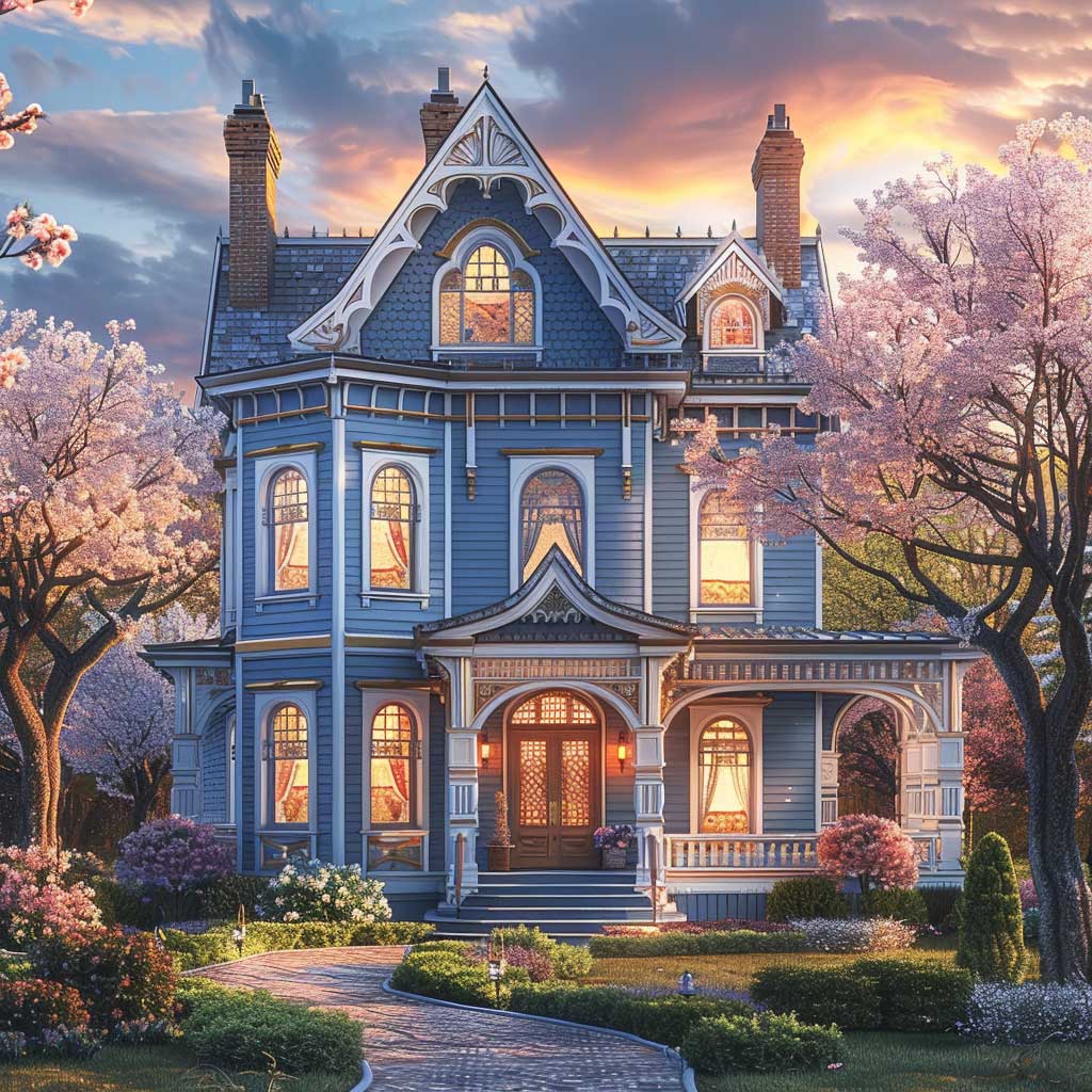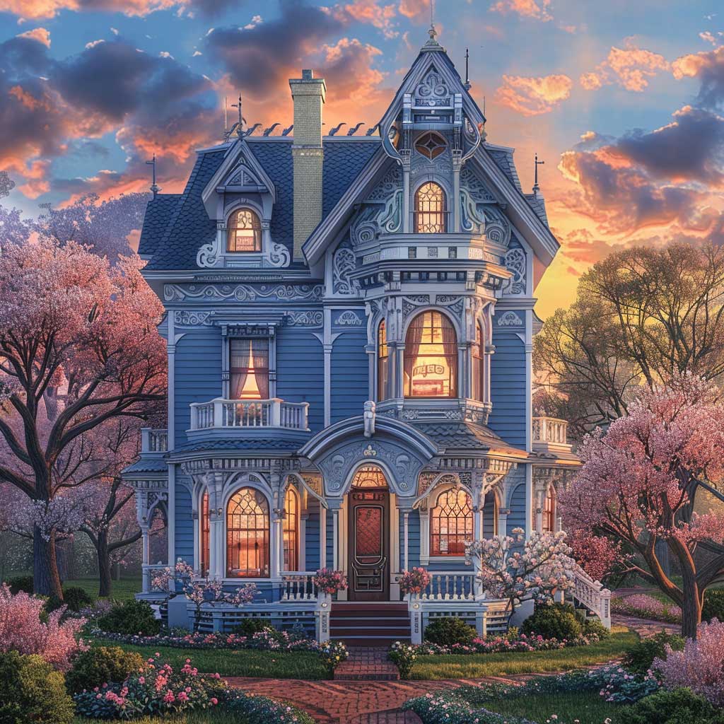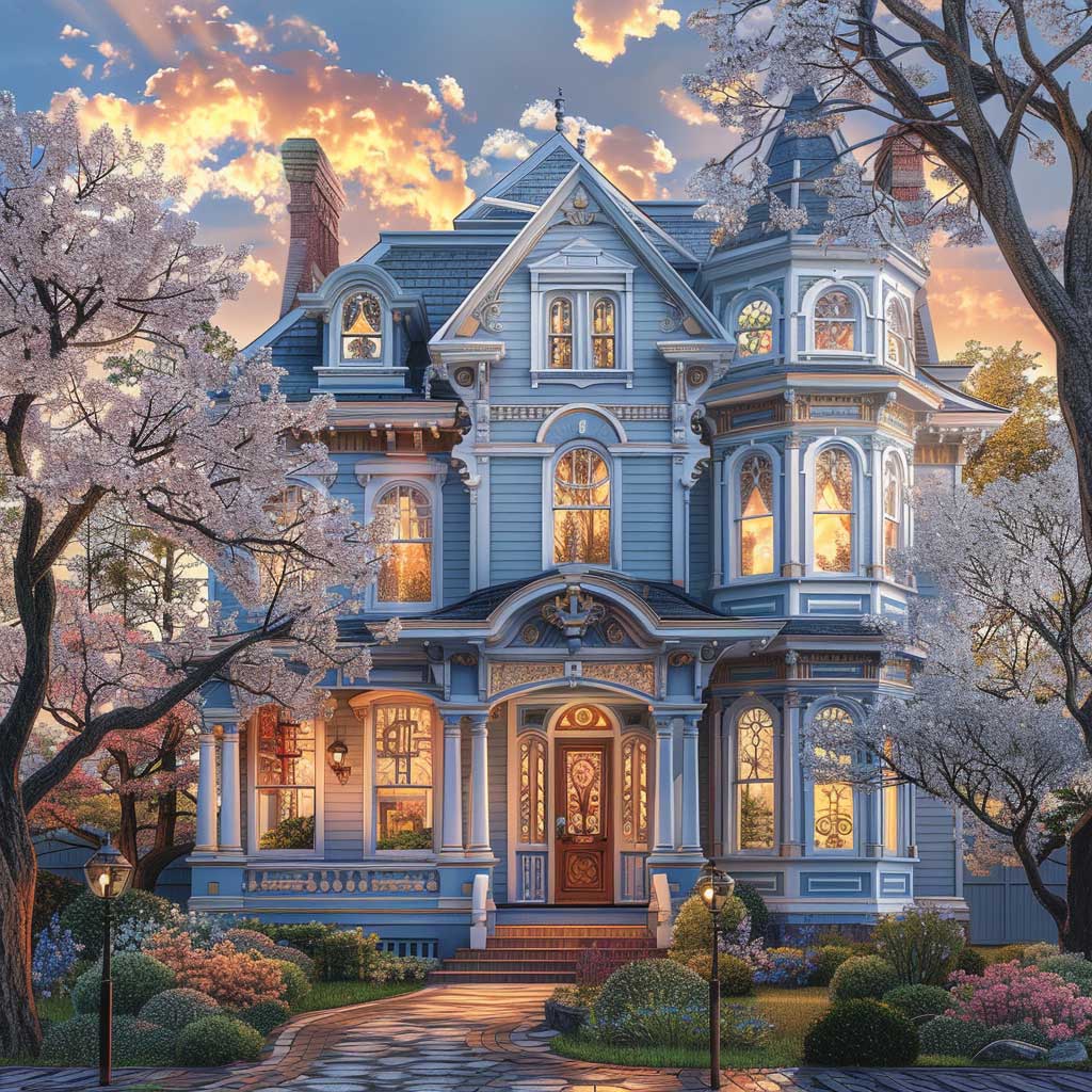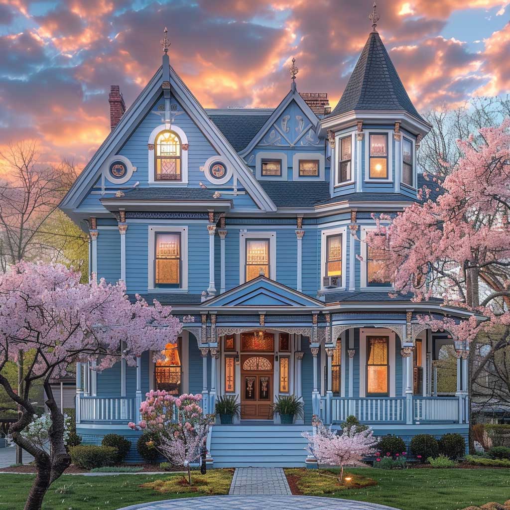 Nestled in an early spring setting, imagine a two-story Victorian house as it stands with dignity and grace. The season is subtly awakening, with the tender buds on the trees beginning to unfurl, hinting at the renewal of life. This home, with its walls painted in soft sky blue, accented by deeper azure trim details, becomes a focal point in the landscape, a beacon of serenity and refinement. The sun, setting in the background, bathes the house in a warm glow, highlighting the intricate woodwork and architectural finesse that define Victorian elegance.
