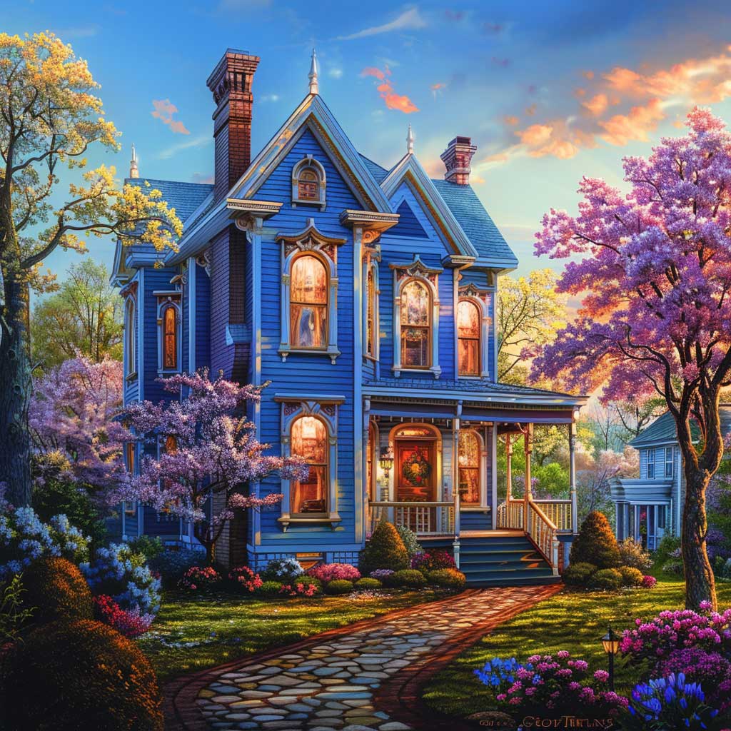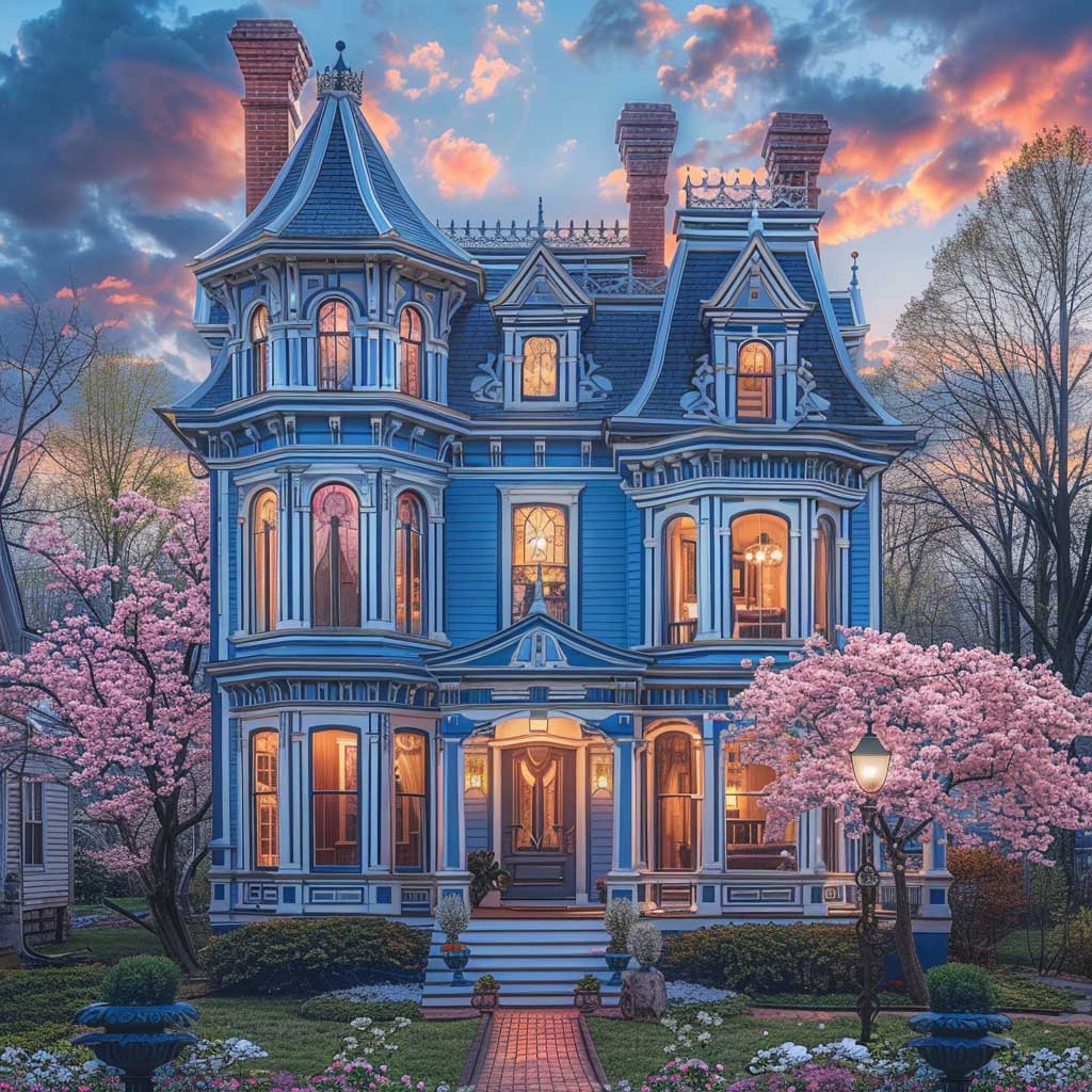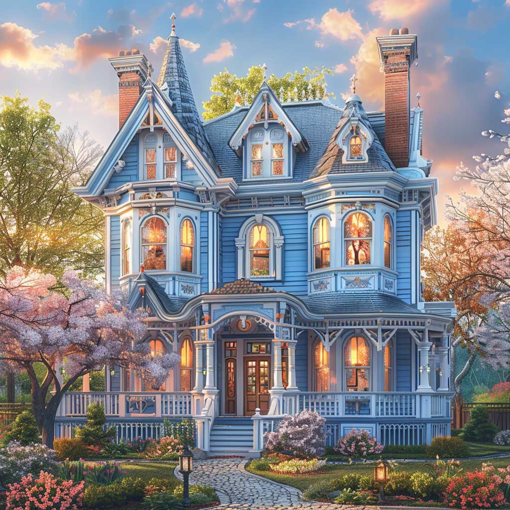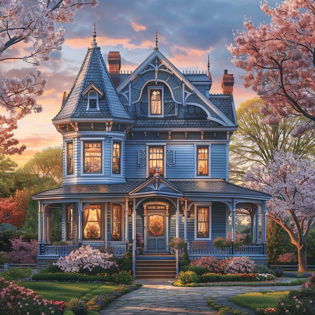 Nestled in an early spring setting, imagine a two-story Victorian house as it stands with dignity and grace. The season is subtly awakening, with the tender buds on the trees beginning to unfurl, hinting at the renewal of life. This home, with its walls painted in soft sky blue, accented by deeper azure trim details, becomes a focal point in the landscape, a beacon of serenity and refinement. The sun, setting in the background, bathes the house in a warm glow, highlighting the intricate woodwork and architectural finesse that define Victorian elegance.