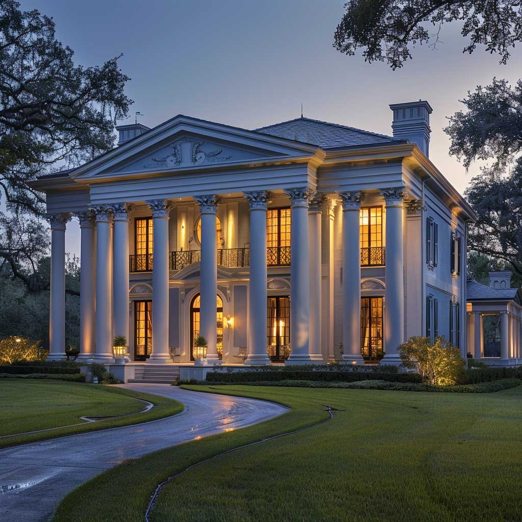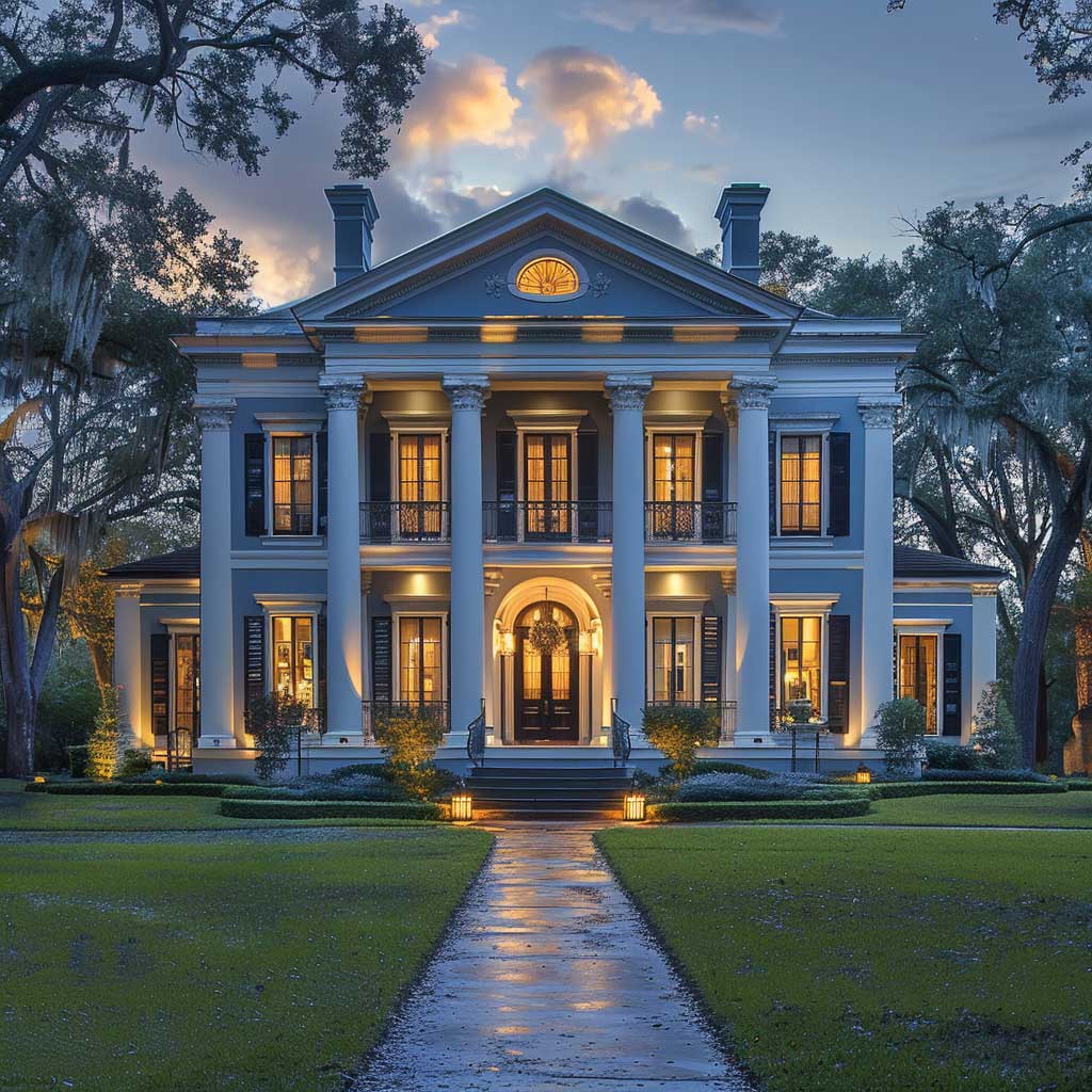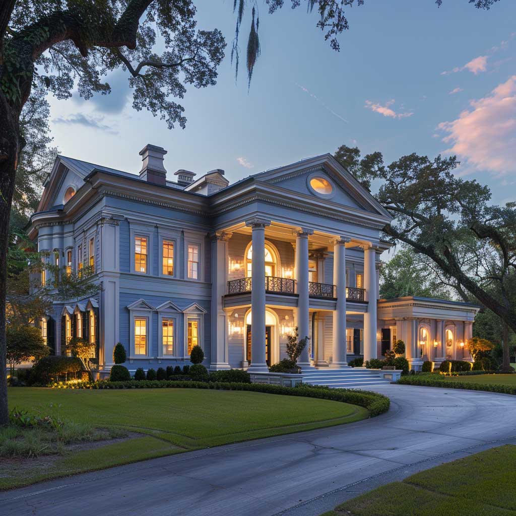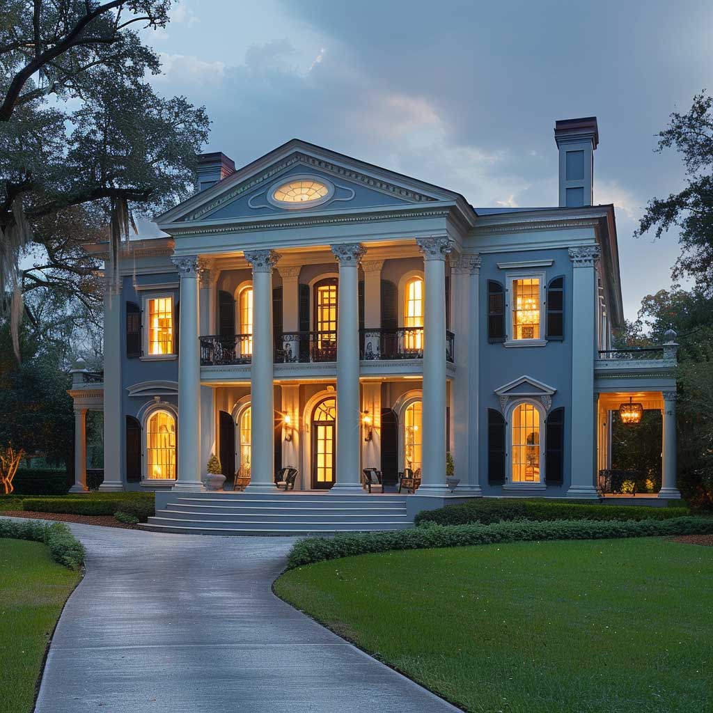 As twilight descends, casting a soft glow over the landscape, the grandeur of the colonial mansion comes into full view. The mansion, set against a backdrop of aged oaks and manicured lawns, presents an imposing yet welcoming presence. Its facade, painted in a harmonious blend of cool blues and gentle grays, reflects the dignity of its architectural lineage. This choice of colors is not incidental but a deliberate nod to the mansion’s noble heritage. The blues, reminiscent of the clear evening sky, and the grays, echoing the subtle shades of twilight, come together to highlight the mansion’s stately columns and decorative moldings.