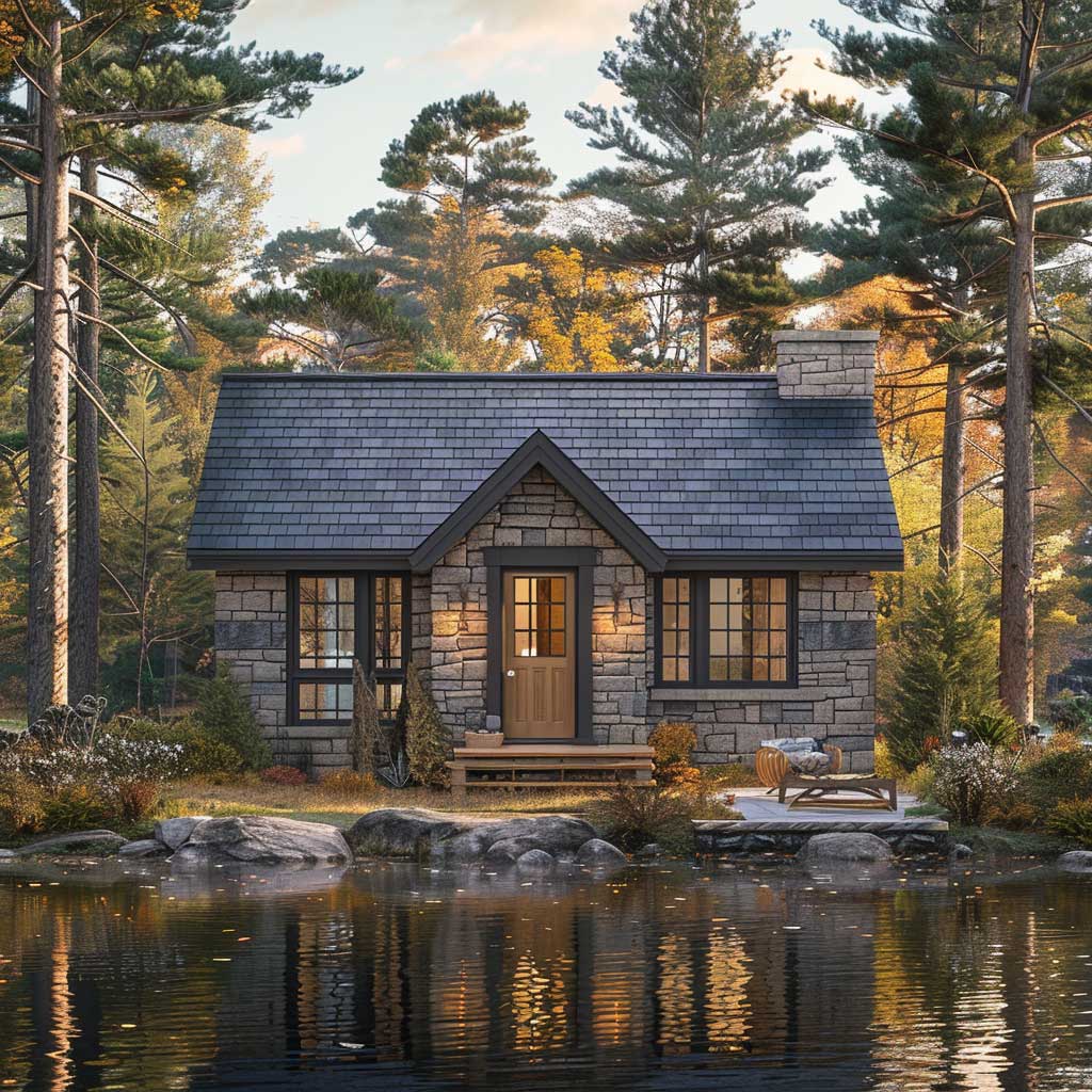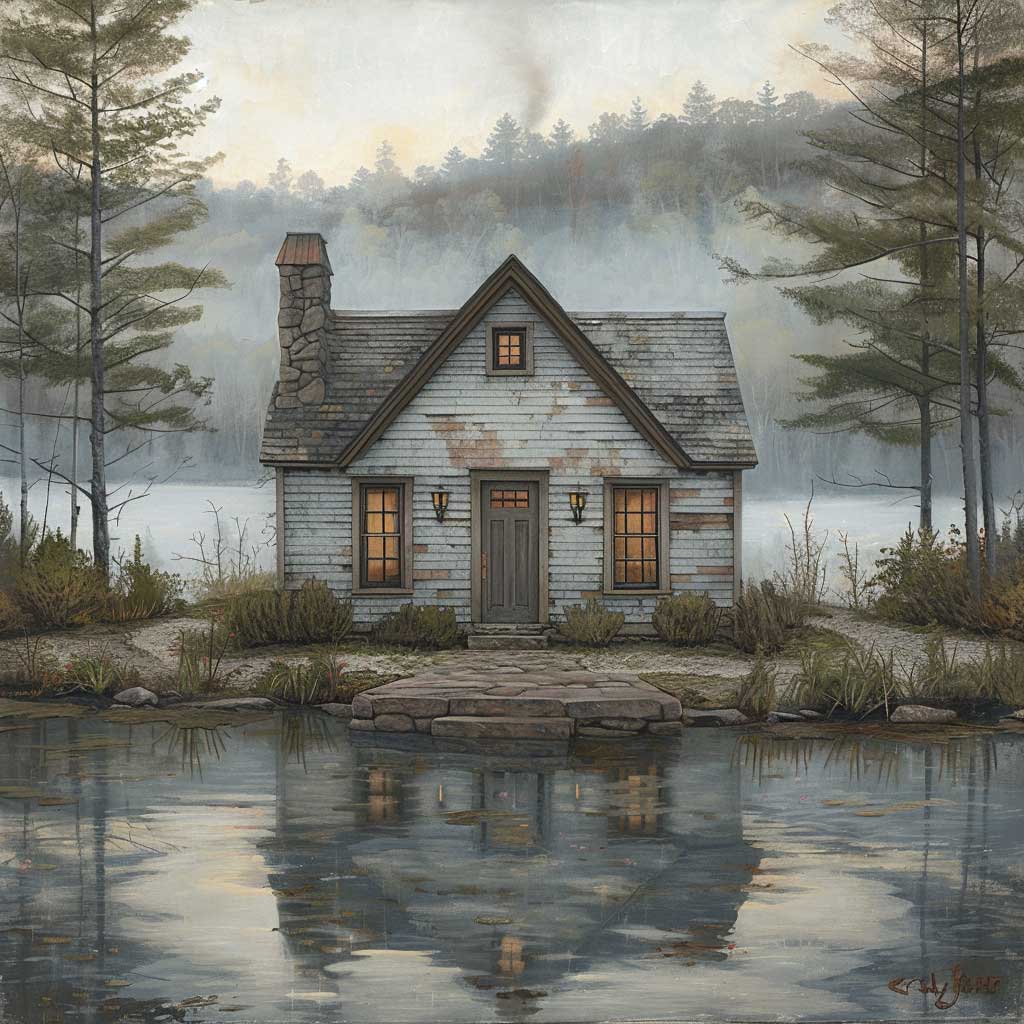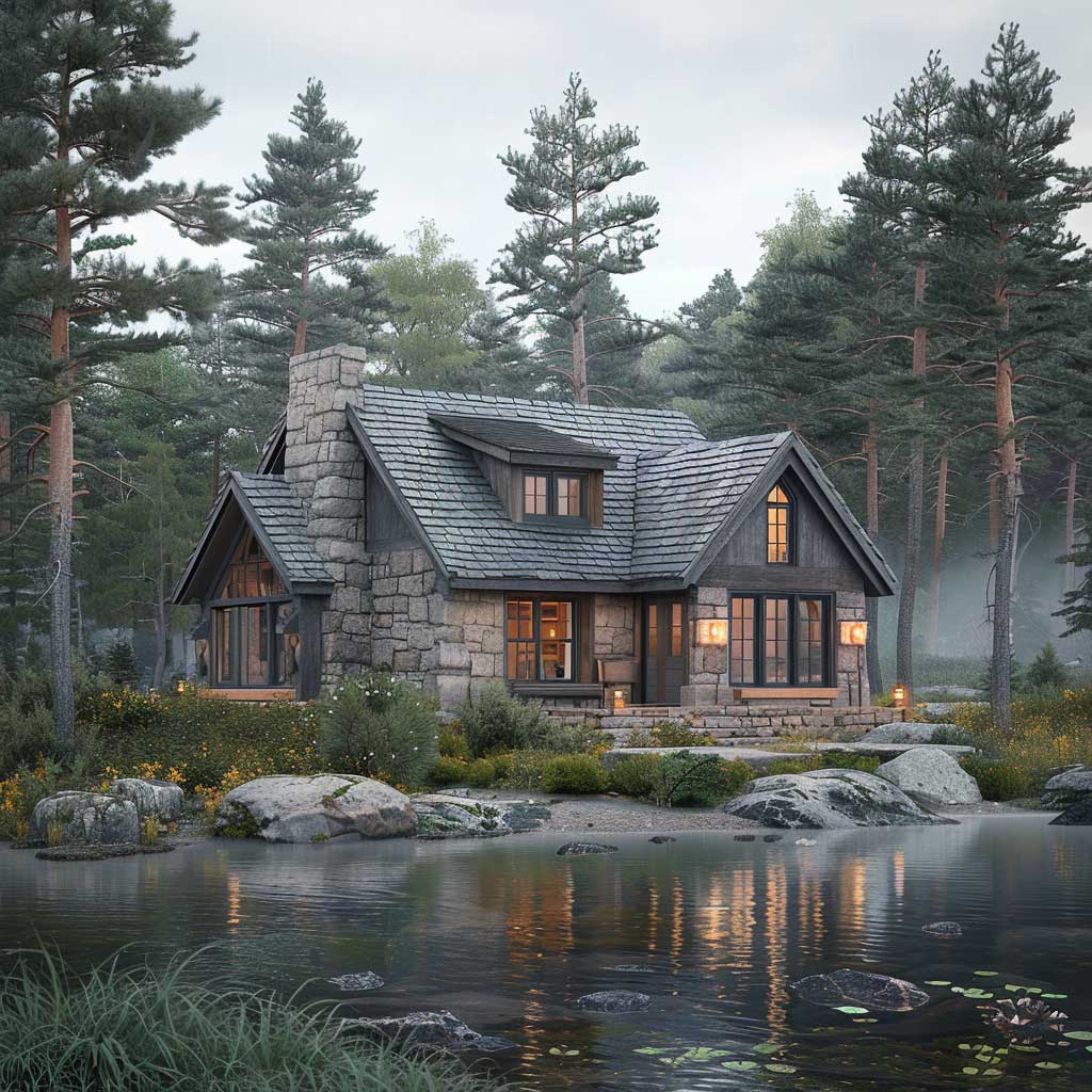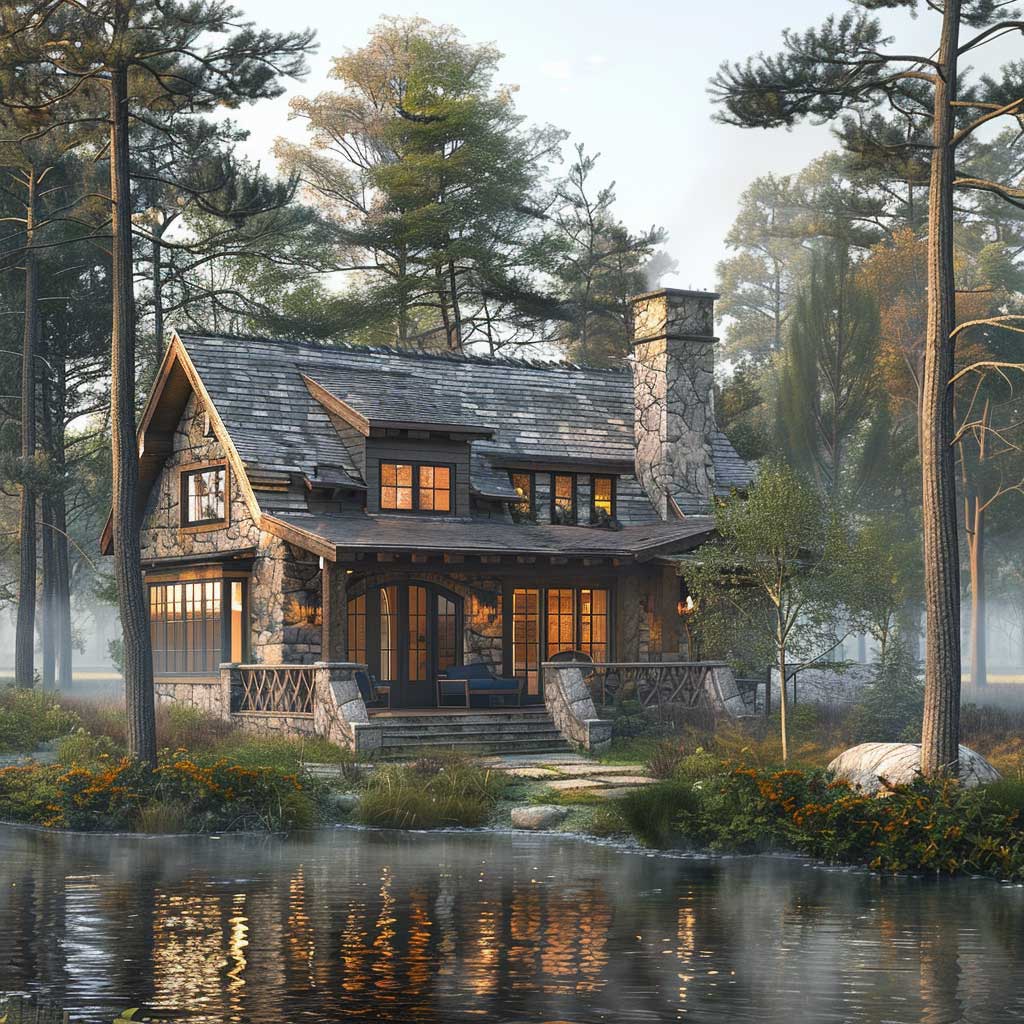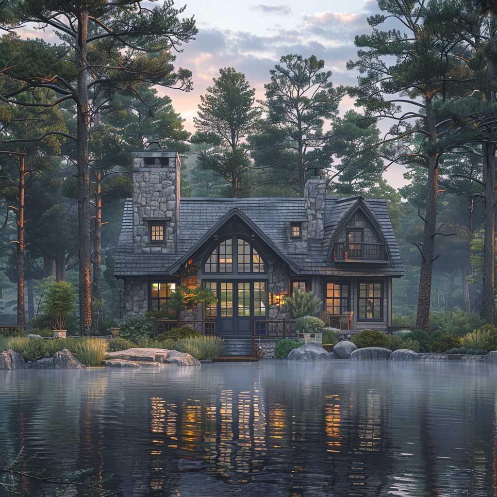 Tucked away at the edge of a placid lake, surrounded by the steadfast presence of mature pine trees, there exists a cottage that serves as a testament to the power of subtle elegance. The cottage, with its walls adorned in soothing shades of gray, harmonizes with the misty mornings and tranquil waters, crafting a scene of unparalleled serenity. The choice of gentle gray for the exterior is deliberate, echoing the colors of the natural stone foundation and blending seamlessly with the surrounding landscape. This color scheme fosters a sense of continuity between the man-made structure and the natural world, emphasizing the cottage’s role as a peaceful retreat from the bustling outside world.
