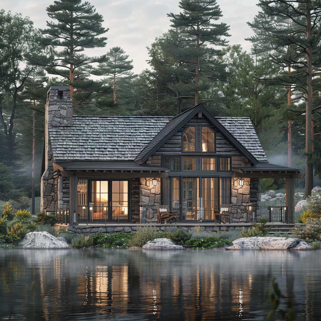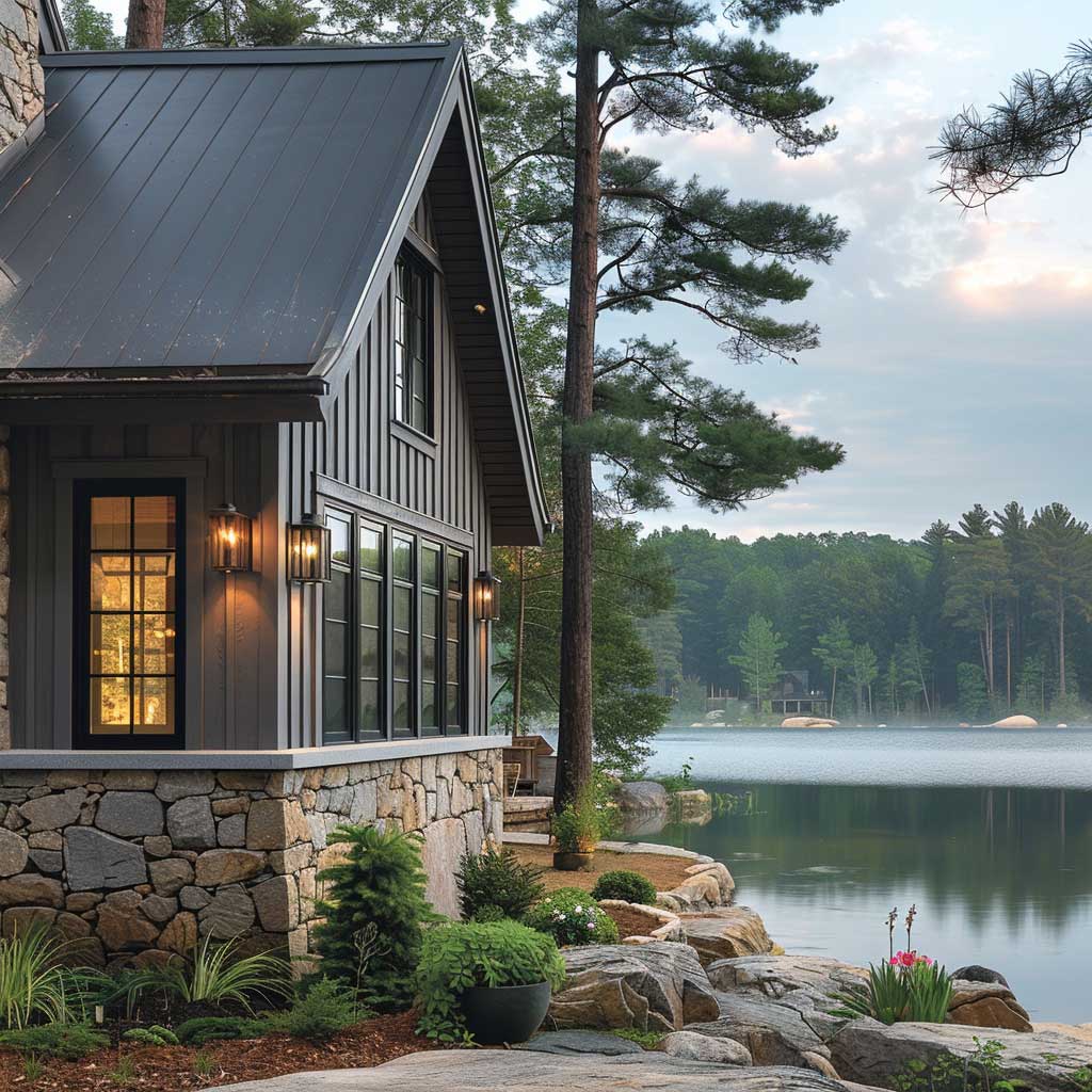 The use of gentle gray in the exterior wall paint designs is not just about aesthetics but also about invoking a mood. Gray, in its myriad shades, carries the versatility to be both grounding and uplifting. In this setting, where the cottage becomes a part of the lakeside tableau, the chosen hues reflect the stillness of the lake and the stoic beauty of the pine trees. The darker shades used for the window frames and doors add depth and dimension, creating a visual anchor that draws the eye and complements the softer shades of the walls.