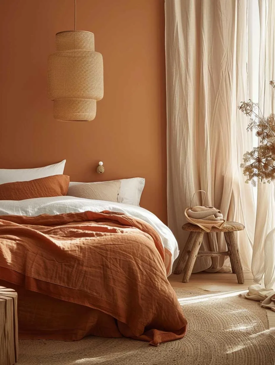 The transformative power of terra cotta in interior design reaches its zenith within the sanctuary of the bedroom. Here, the palette’s soothing qualities are harnessed to create a serene oasis, a retreat from the world’s hustle and bustle. The terra cotta palette, with its earthy and warm undertones, brings a sense of calm and grounding, making it an ideal choice for a space dedicated to rest and rejuvenation.
