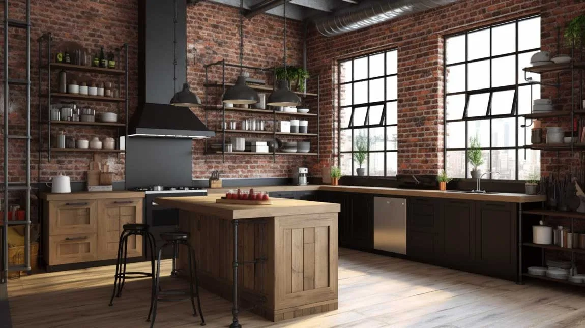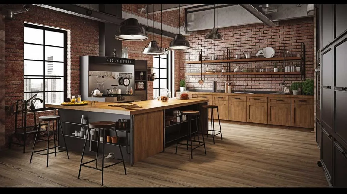 Combine materials such as concrete countertops, brick backsplashes, and stainless steel appliances to create a harmonious blend of industrial and modern elements. Add warmth and character by incorporating natural wood accents in the form of open shelves, a butcher block island, or wooden barstools.