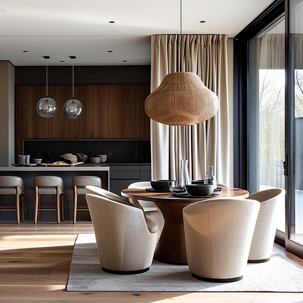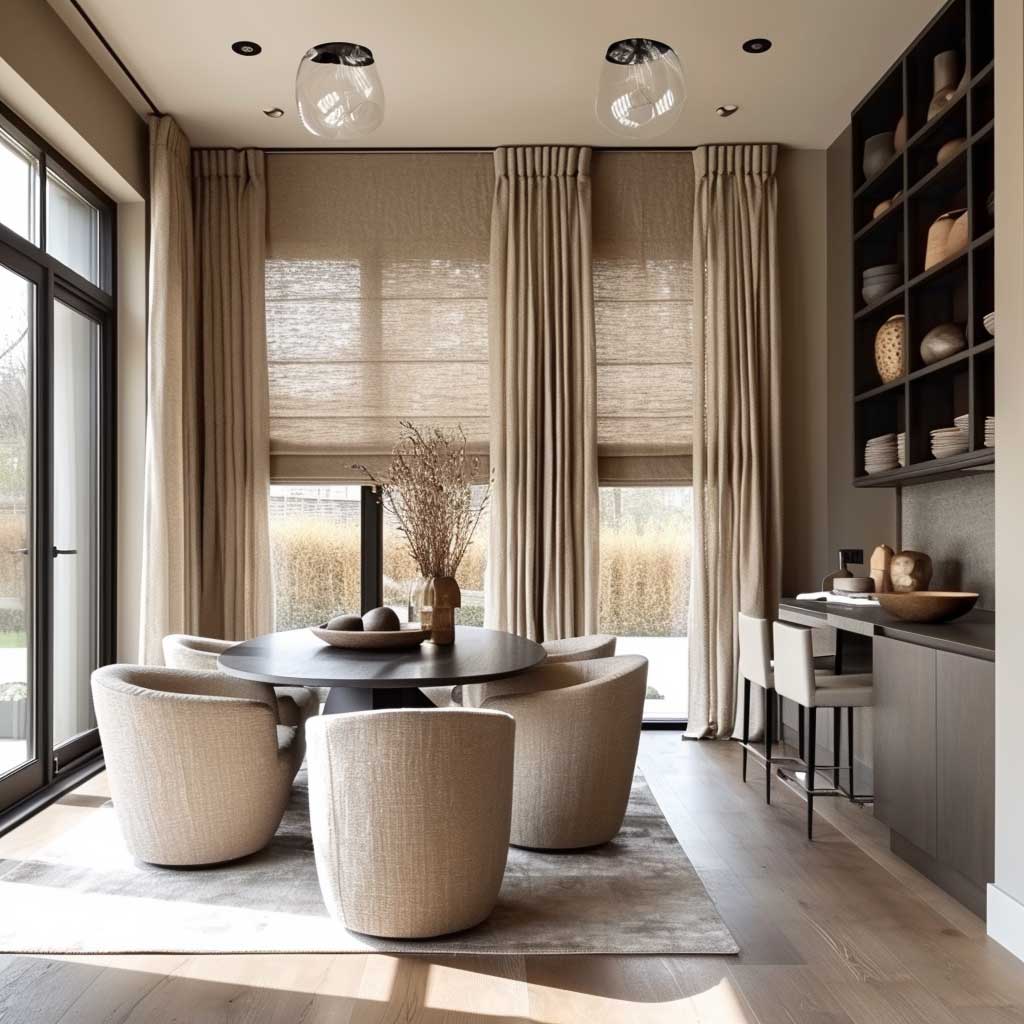 The beauty of solid neutral drapes lies in their understated presence. They provide a clean, unobtrusive backdrop that complements the minimalist ethos of less is more. The absence of patterns or loud colors ensures that the drapes do not dominate the room but rather enhance the overall calm and orderly feel. In a modern dining area, for instance, these drapes can add a touch of refinement without detracting from the room’s focal points, be it a statement dining table or a piece of art.