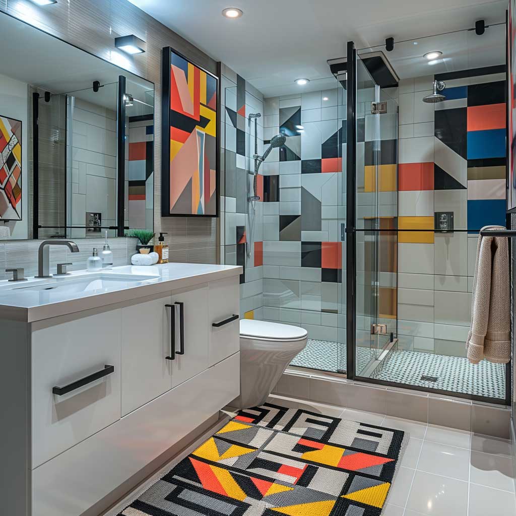 Some of them are really good choices; this one just kind of gets along well with the geometric theme rather than fighting with it. Even to the floor, different geometric tile can tie the whole look together, making the bathroom a statement not just of daily routine but a sense of personal creativity. This setup is perfect for whoever respects his abode as a reflection of his idiosyncratic taste and preference, where functionality binds with art.