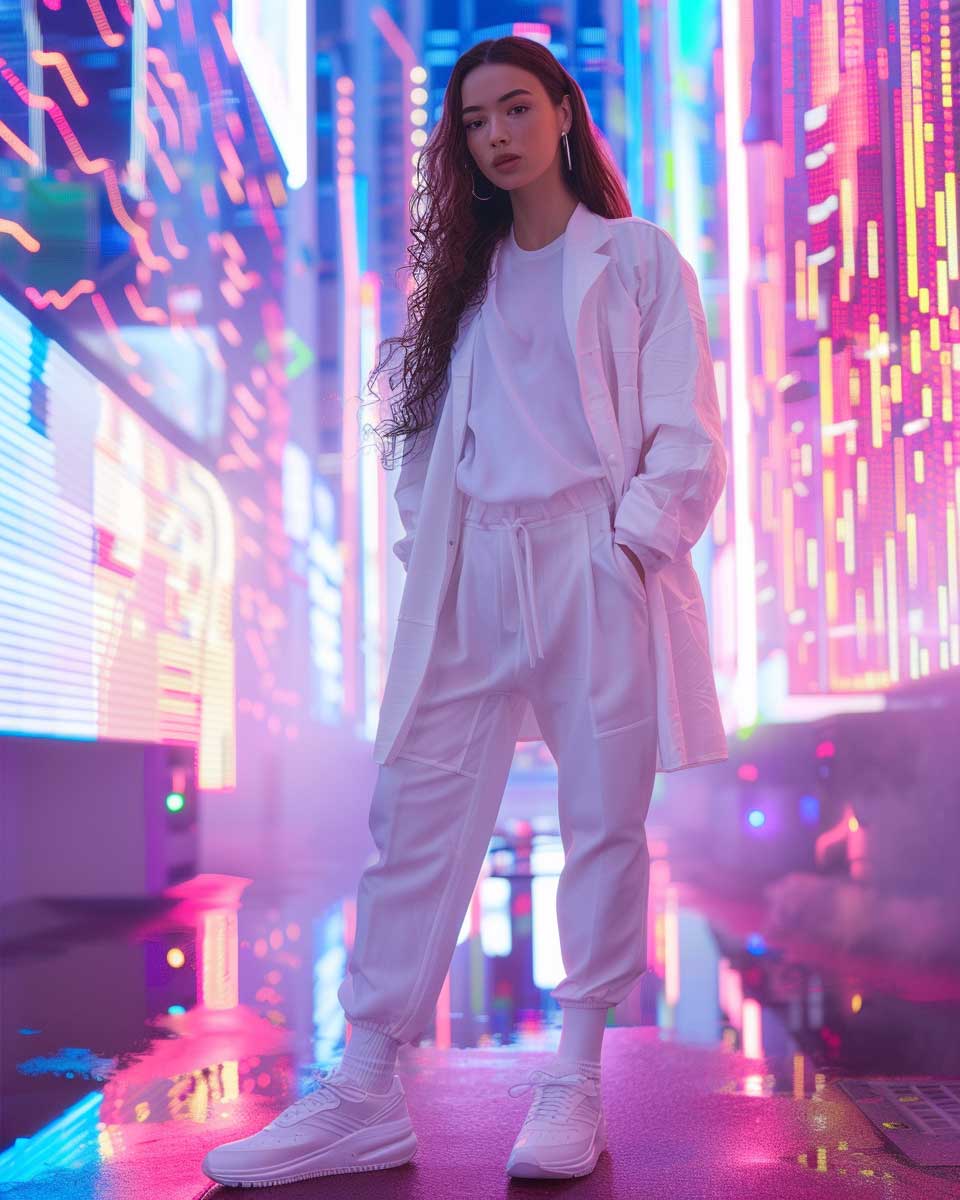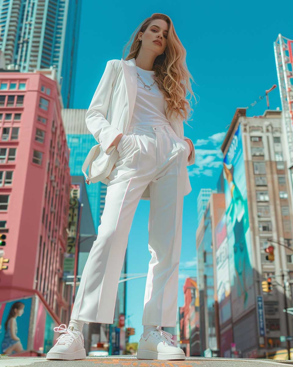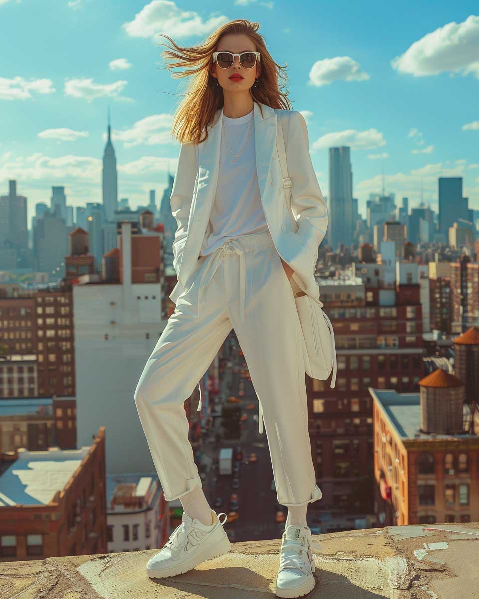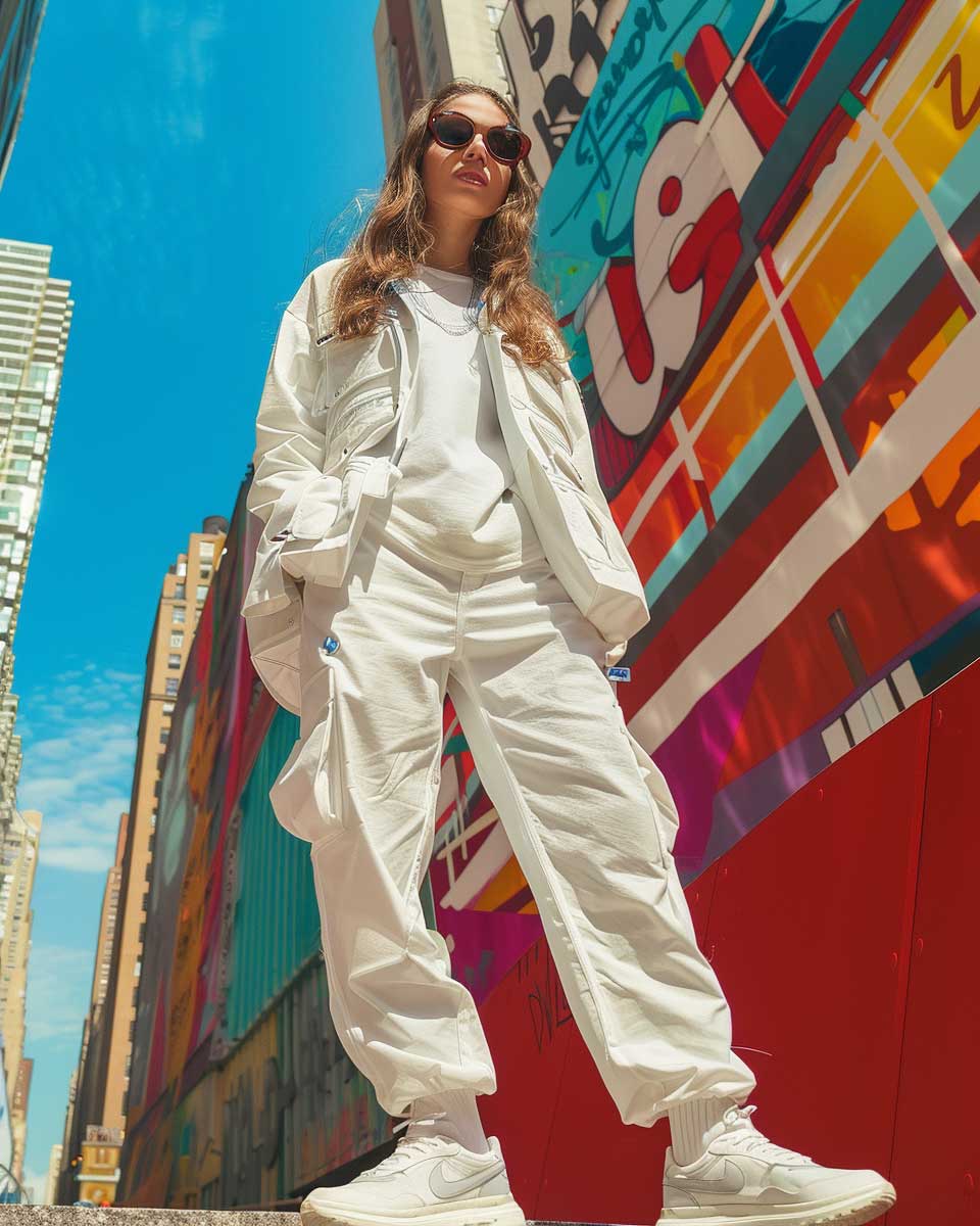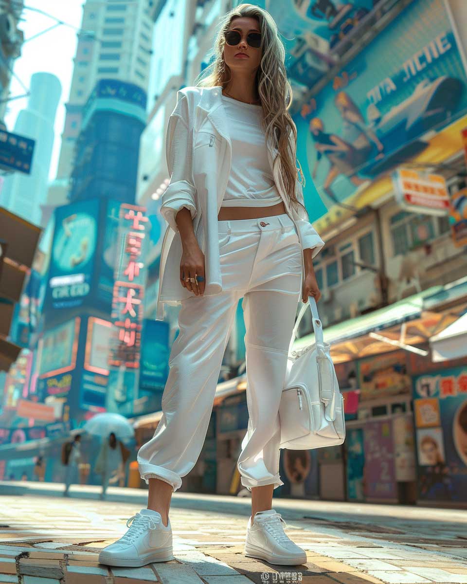 This vision of trendsetting white outfit ideas for urban explorers redefines the concept of streetwear. It merges the crisp, clean lines of white with the architectural elements of the urban setting, creating a look that is both avant-garde and accessible. This ensemble is a tribute to those who view the city as their playground, a place where fashion serves as both armor and expression. In this narrative, white transcends its purity to become a symbol of strength and innovation, inviting us to explore the endless possibilities that lie in the heart of the city.