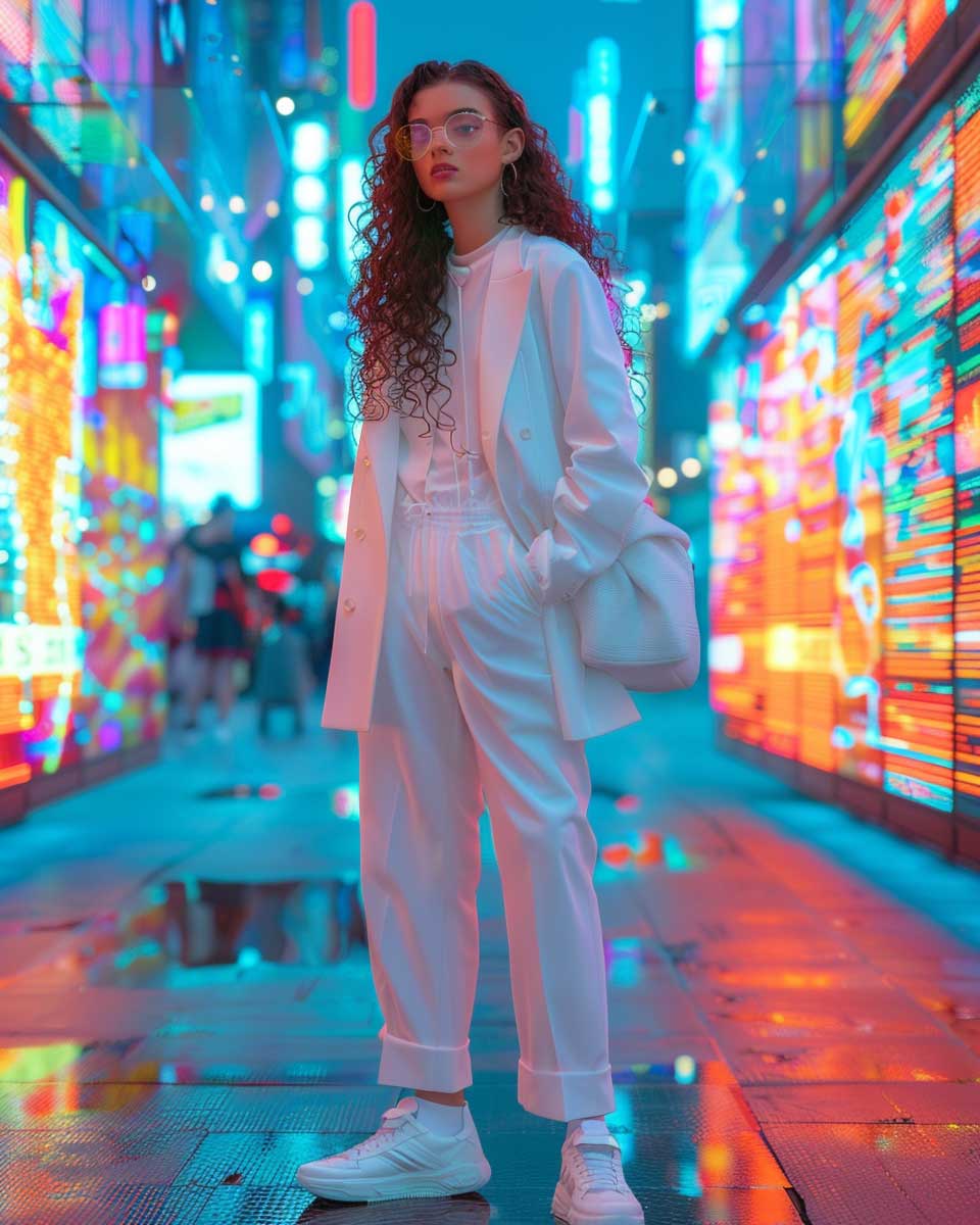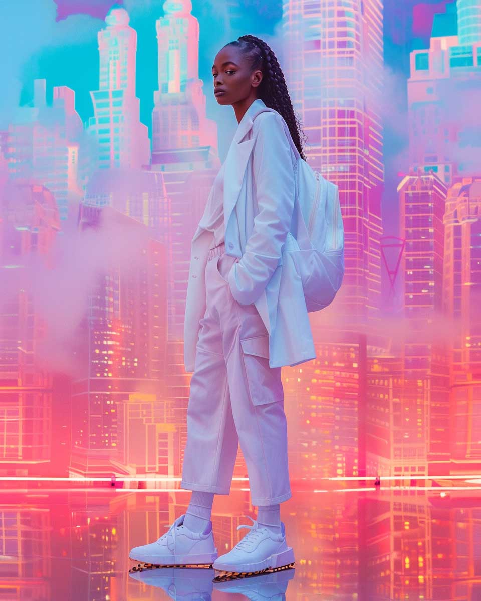 The outfit, a meticulously curated combination of high-waisted trousers and a crisp white t-shirt, layered with a structured blazer, embodies the dynamic spirit of the city. Bold sneakers and a statement backpack add an edge to the ensemble, blending functionality with fashion. The backdrop of the vibrant cityscape not only enhances the outfit’s appeal but also signifies the wearer’s connection to the urban pulse.