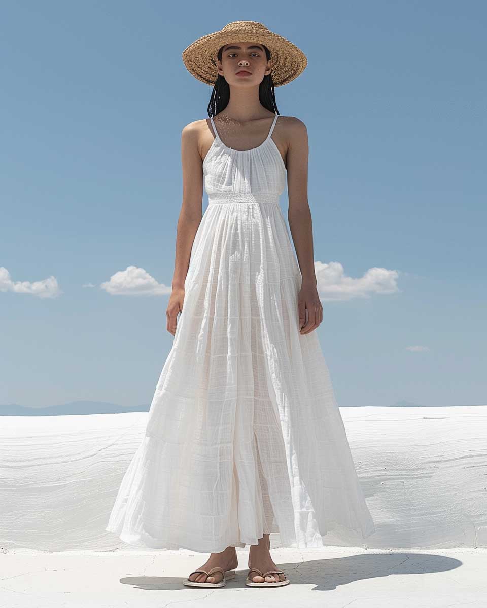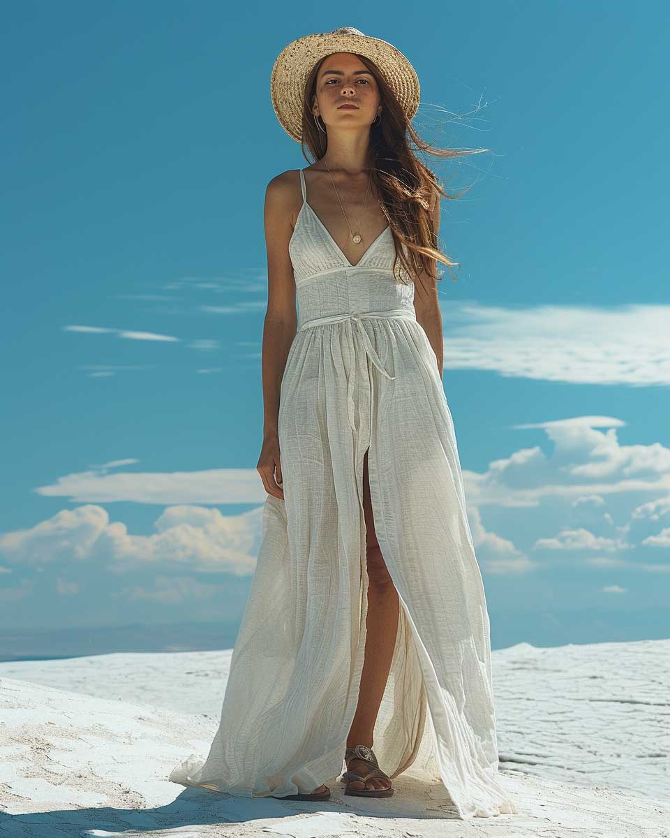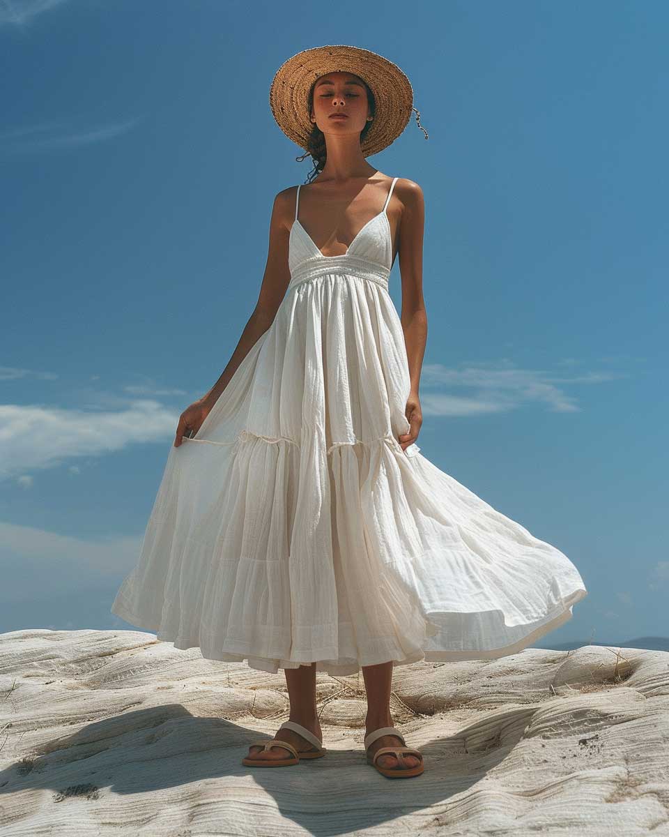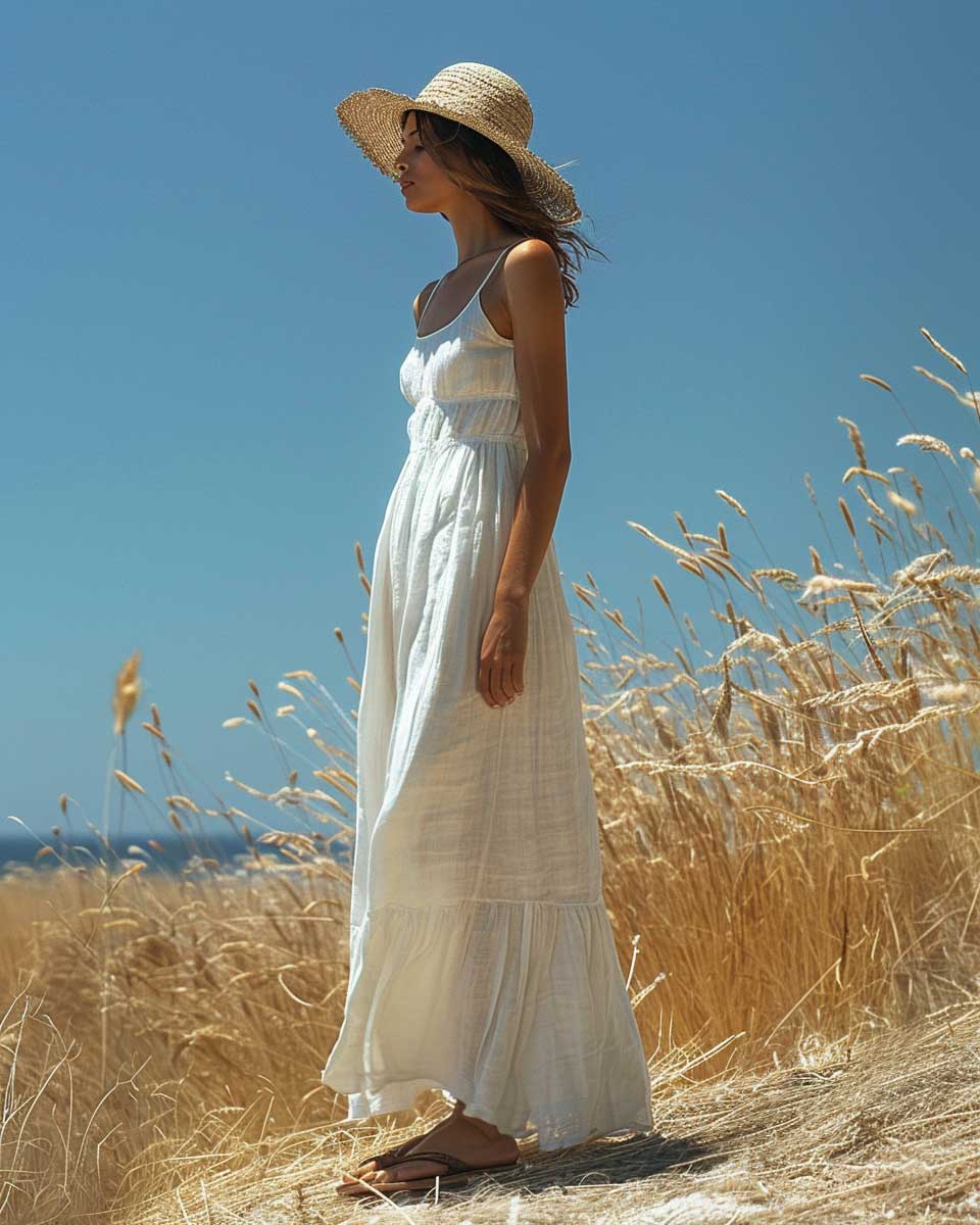 This ensemble speaks to those who seek to merge style with comfort. The white linen dress, a staple of summer wardrobes, offers a blank canvas that reflects the season’s brightness. Accessories play a subtle yet significant role in elevating the outfit. The straw hat, a nod to classic summer aesthetics, not only protects from the sun but also adds a touch of sophistication. Sandals, chosen for their simplicity, ensure the look remains grounded in comfort and practicality.