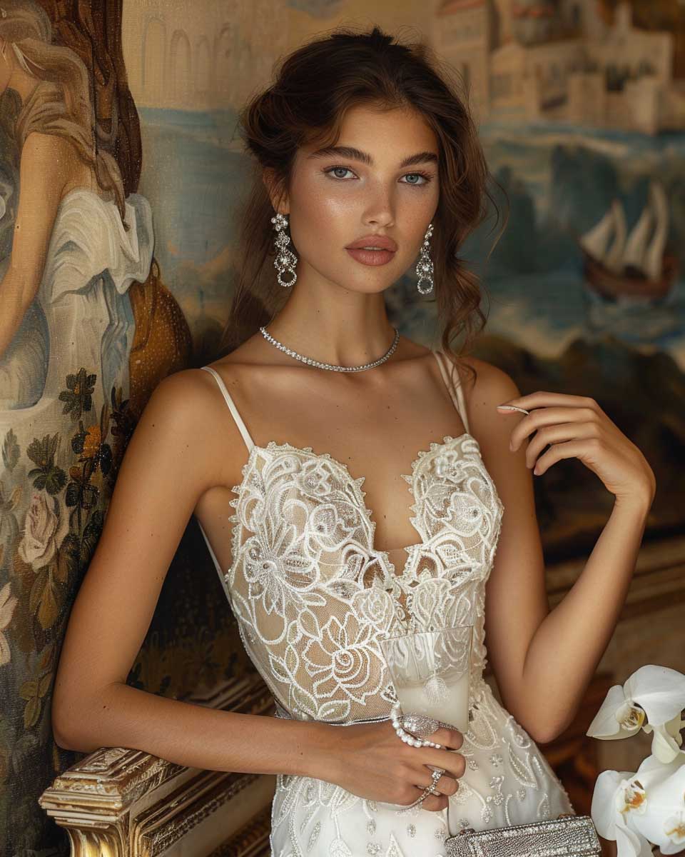 The gown, adorned with intricate lace details, cascades down in a harmonious flow, encapsulating the essence of evening allure. Silver statement jewelry serves as the constellation to this celestial body, adding a sparkle that rivals the stars. A sleek clutch in hand is the final touch, the epitome of chic refinement. Set against the backdrop of an elite evening event, this outfit idea transcends the boundaries of fashion to become a symbol of timeless elegance.