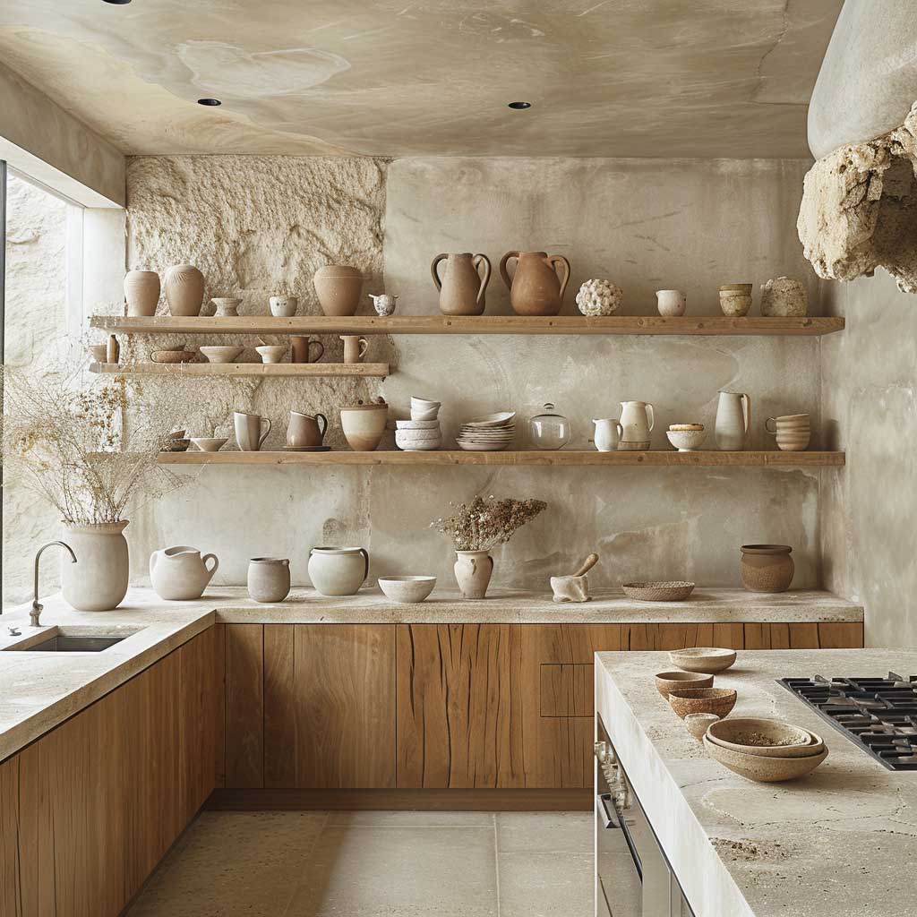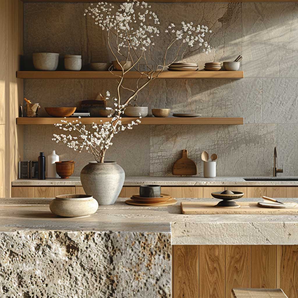 The use of wooden cabinets and shelves introduces a natural element that instantly warms up the space, while stone countertops add a touch of cool serenity. Together, these materials create a balanced environment that feels grounded and inviting. Incorporating ceramic accessories in soft pastels contributes subtle splashes of color, enhancing the kitchen’s visual appeal without overwhelming the senses.