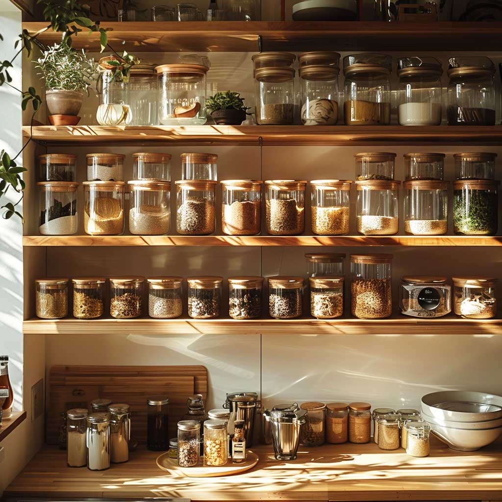 Implementing such storage solutions requires a mindful selection of containers and organizers that not only serve their purpose but also enhance the kitchen’s overall ambiance. Wooden containers, with their natural textures and warm tones, bring a sense of earthiness and calm. Spices stored in clear jars not only make it easy to find what you need but also add a decorative element, especially when arranged in a neat row or pattern that pleases the eye. The strategic use of plants among these items introduces a lively burst of green, symbolizing growth and renewal. This setting, illuminated by soft, natural light, not only maximizes functionality but also promotes a sense of well-being.