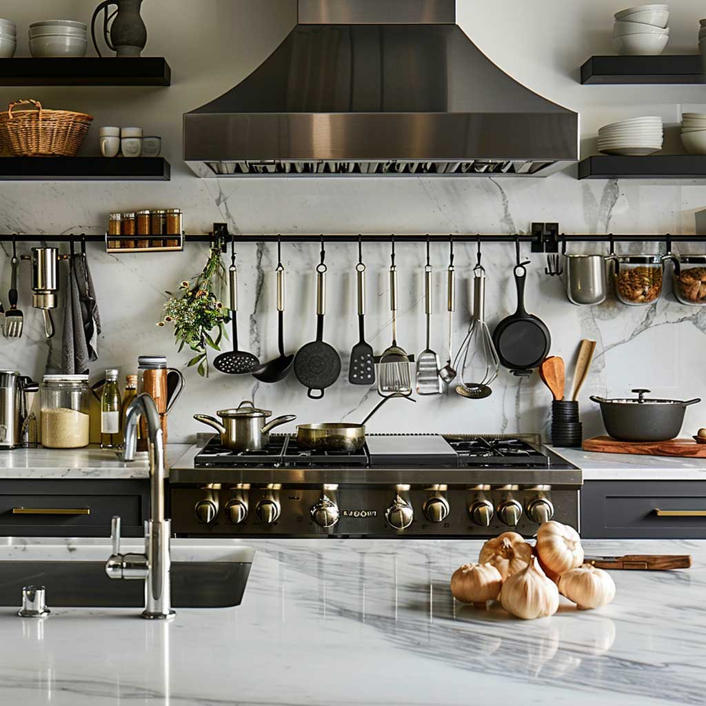 Similarly, utensils stored in modern holders and ingredients displayed in uniform, labeled containers contribute to a kitchen’s functionality and aesthetic appeal. The use of marble countertops not only offers a durable and easy-to-clean surface but also adds a touch of elegance. When kitchen essentials are organized with such attention to detail, the entire space becomes more welcoming and efficient.