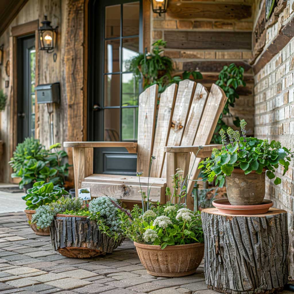 No rustic retreat is complete without the lushness of greenery and the charm of wildflowers. Consider incorporating a variety of plants that thrive in your climate, from ferns and succulents to flowering plants that attract butterflies and birds. Arranging these in mismatched pots and containers adds to the casual, laid-back feel of the space. A vertical garden or a trellis adorned with climbing vines can create a living wall, adding privacy and a touch of mystery to your front patio.