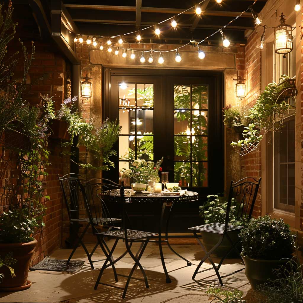 The right lighting can transform your rustic front patio into an enchanting evening retreat. Solar-powered lanterns, string lights with a soft, warm glow, or even candles in hurricane lanterns can create a magical atmosphere as dusk falls. The play of light and shadow among the plants and furnishings adds depth and dimension to the space, enhancing the rustic charm.