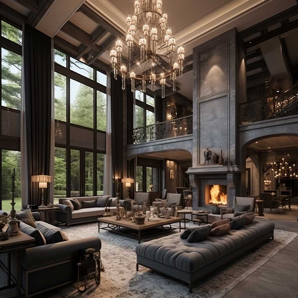 A grand fireplace is a common focal point in these rooms, providing warmth and a sense of grandeur. It’s often surrounded by elegant seating, creating an ideal spot for relaxation and socializing.