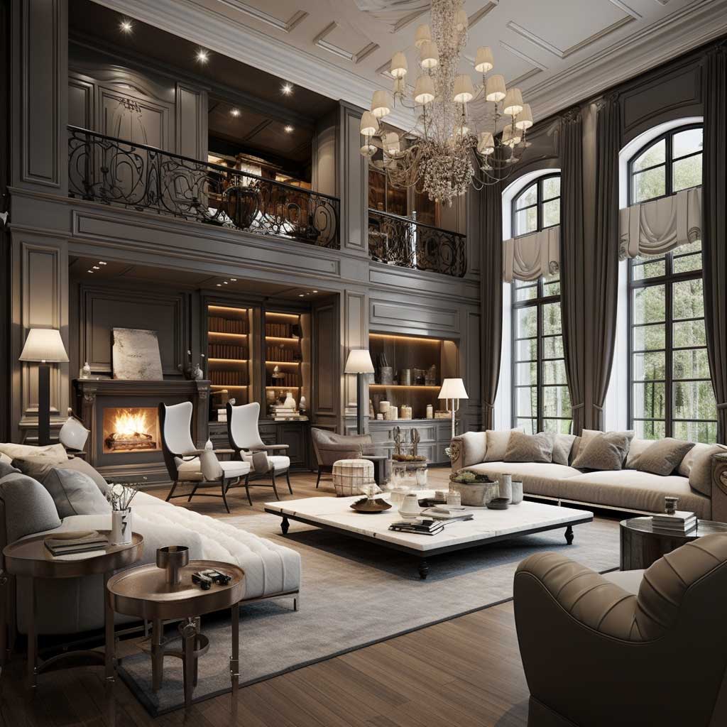 Lighting is crucial in establishing the room’s mood. Statement lighting fixtures, like chandeliers or designer lamps, add to the room’s luxury. Decor is opulent yet tasteful, with items like ornate mirrors, fine art, and plush rugs.