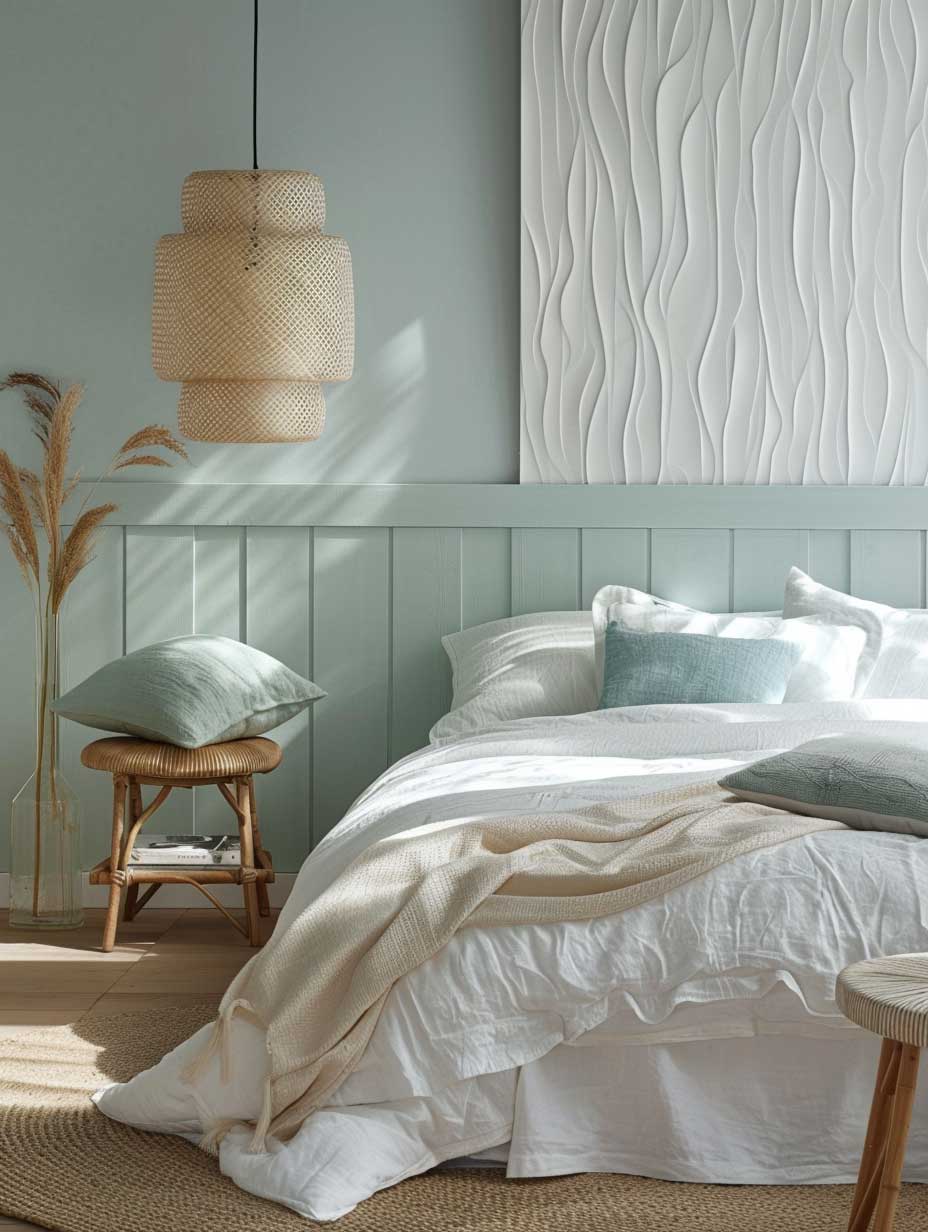 To further personalize the space and enhance the calming effect, consider adding a statement wall with a subtle pattern or texture. Wallpaper with a gentle floral or geometric pattern, or a textured paint finish, can add visual interest without overwhelming the senses. This focal point can draw the eye and add a touch of elegance to the room, complementing the soothing color scheme and contributing to the overall serene ambiance.