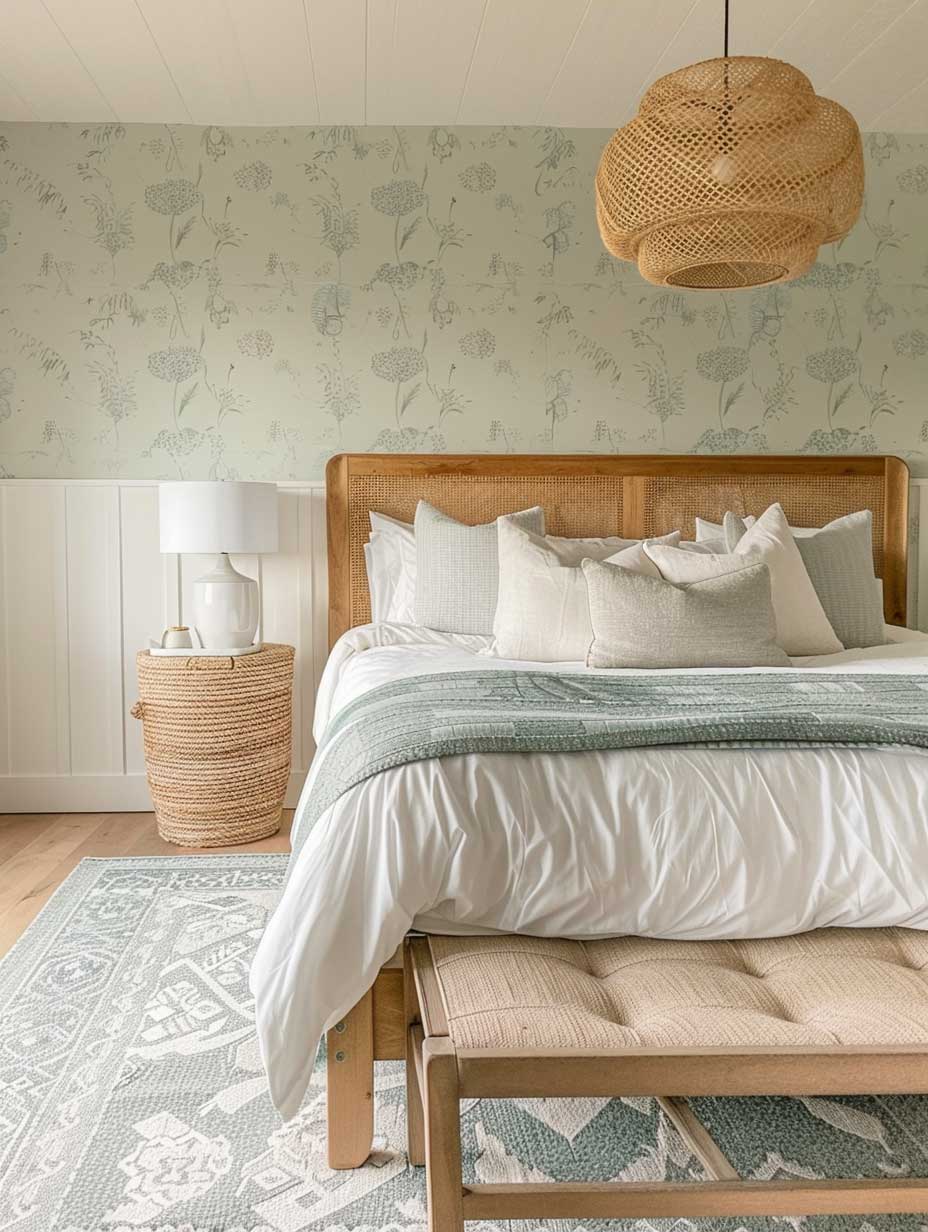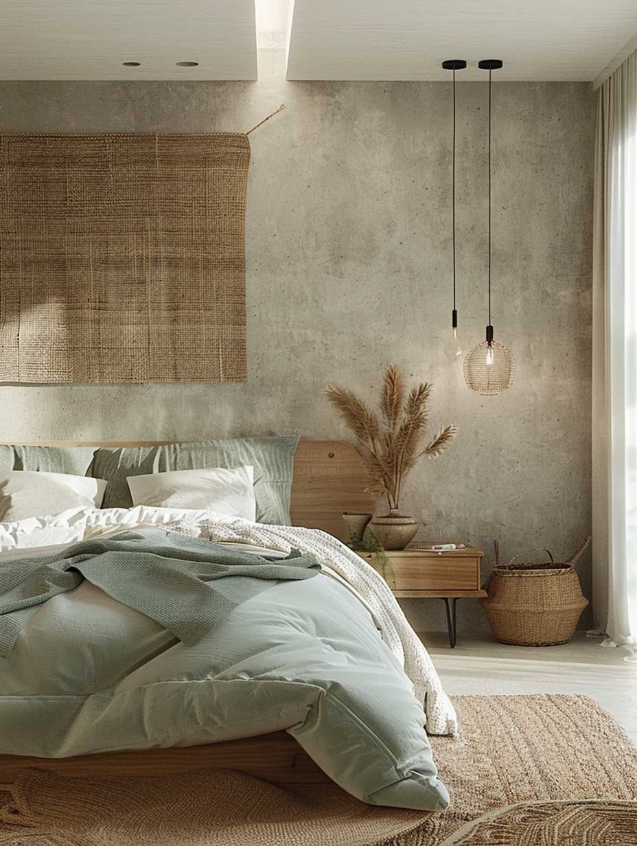 The use of natural wood furniture in the bedroom adds warmth and texture, complementing the soft color palette. Wood’s natural grains and colors can vary from light and airy to rich and cozy, allowing for flexibility in designing a room that suits your personal taste and comfort needs. A beautifully crafted wooden bed frame, paired with a matching nightstand and dresser, can anchor the room and provide a sense of stability and earthiness.