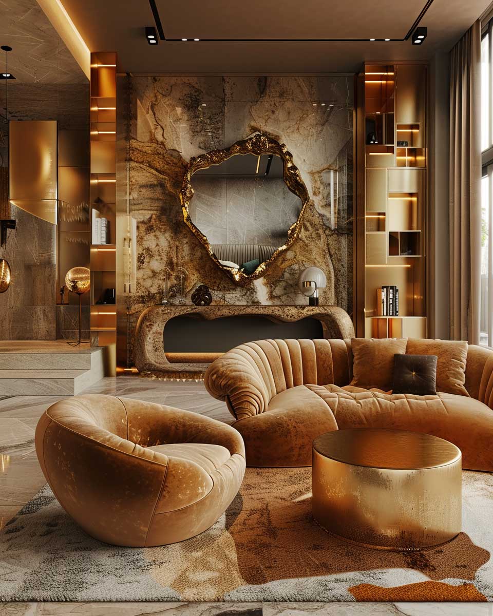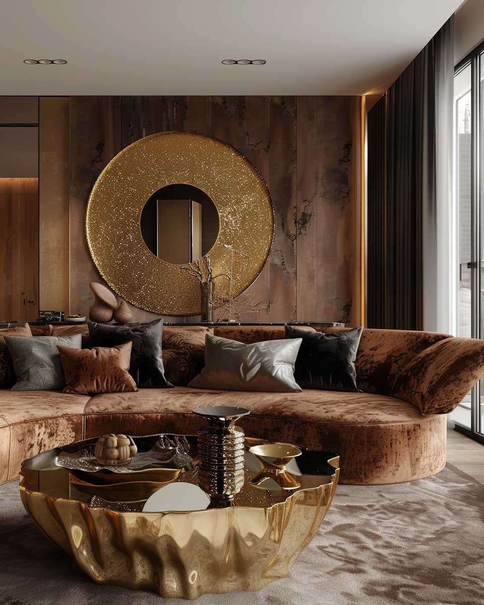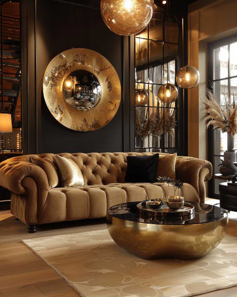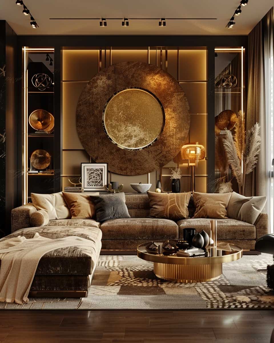 Gold, with its inherent luster and warmth, serves as the ideal complement to these earthy backgrounds. In this imagined living room, gold highlights are not just decorative accents but narrators of a story of luxury and comfort. Picture a sleek, modern chandelier with gold accents hanging from the ceiling, casting a soft, inviting glow over the room. The light reflects off gold-framed mirrors and picture frames, adding depth and expanding the space visually.