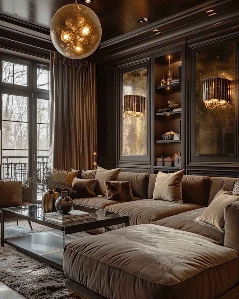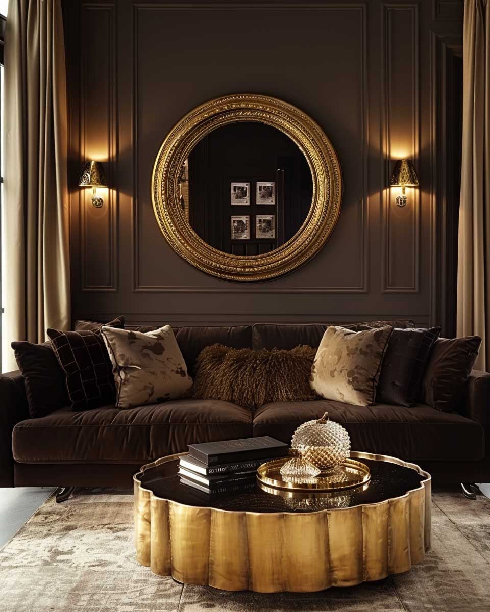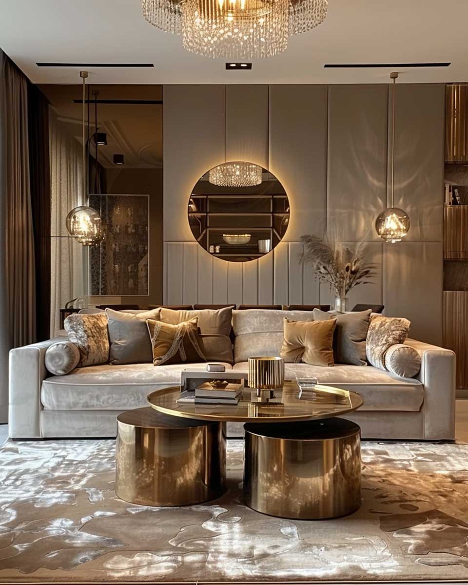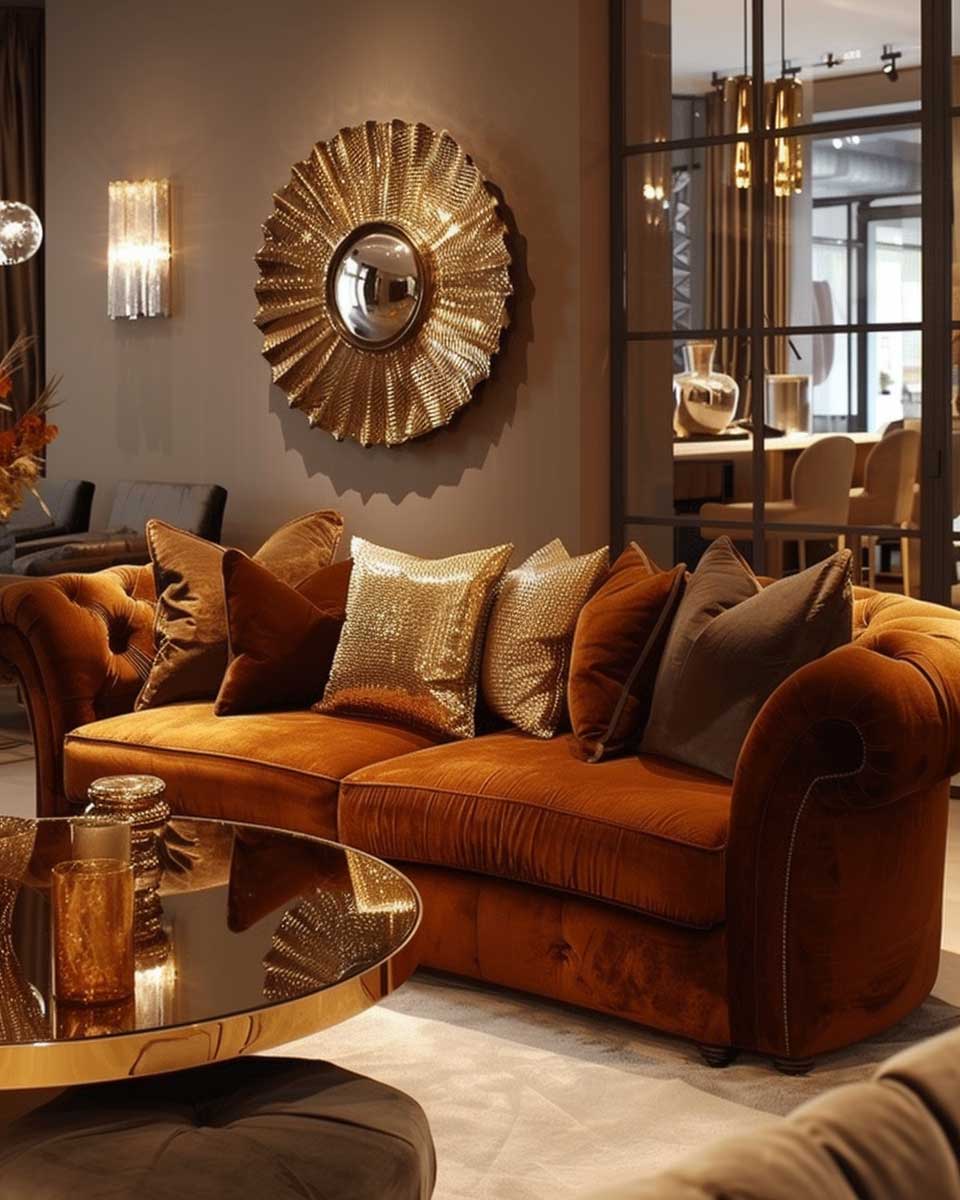 Gold, with its inherent luster and warmth, serves as the ideal complement to these earthy backgrounds. In this imagined living room, gold highlights are not just decorative accents but narrators of a story of luxury and comfort. Picture a sleek, modern chandelier with gold accents hanging from the ceiling, casting a soft, inviting glow over the room. The light reflects off gold-framed mirrors and picture frames, adding depth and expanding the space visually.