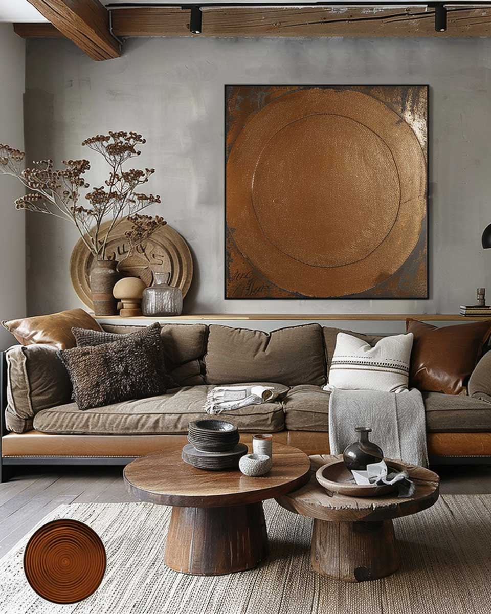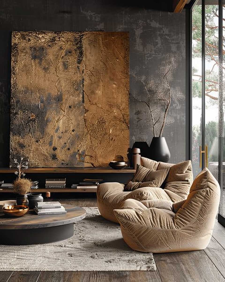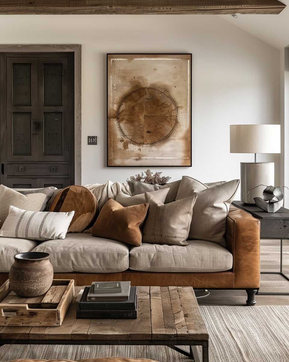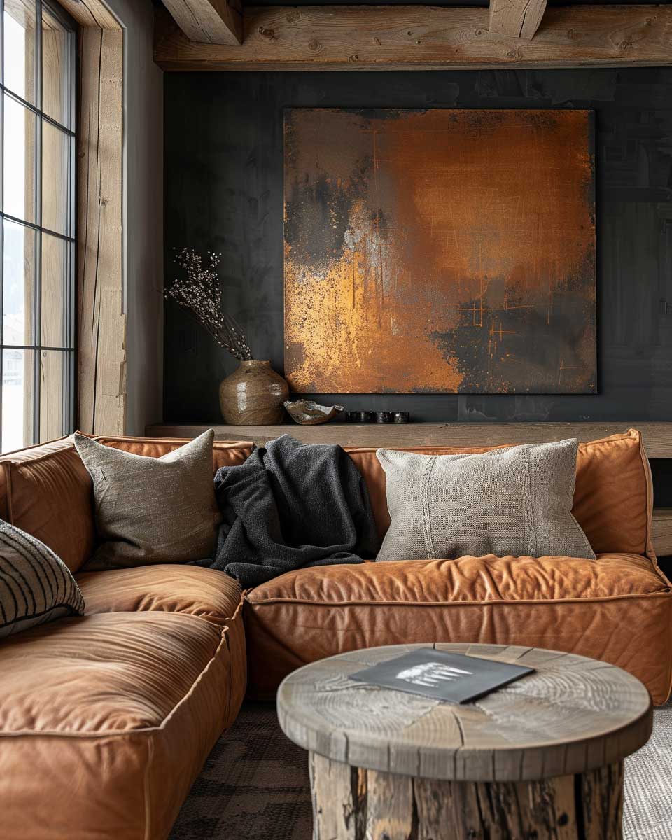 Accessories and decor in this living room further accentuate the rustic urban aesthetic. From bronze sculptures that tell a story of heritage and artistry to throw pillows in earthy hues with bronze thread embroidery, each element is carefully chosen to add to the narrative of the space. Even the floor coverings, perhaps a vintage rug with hints of bronze and taupe, play a role in tying the room together, adding texture and warmth underfoot.