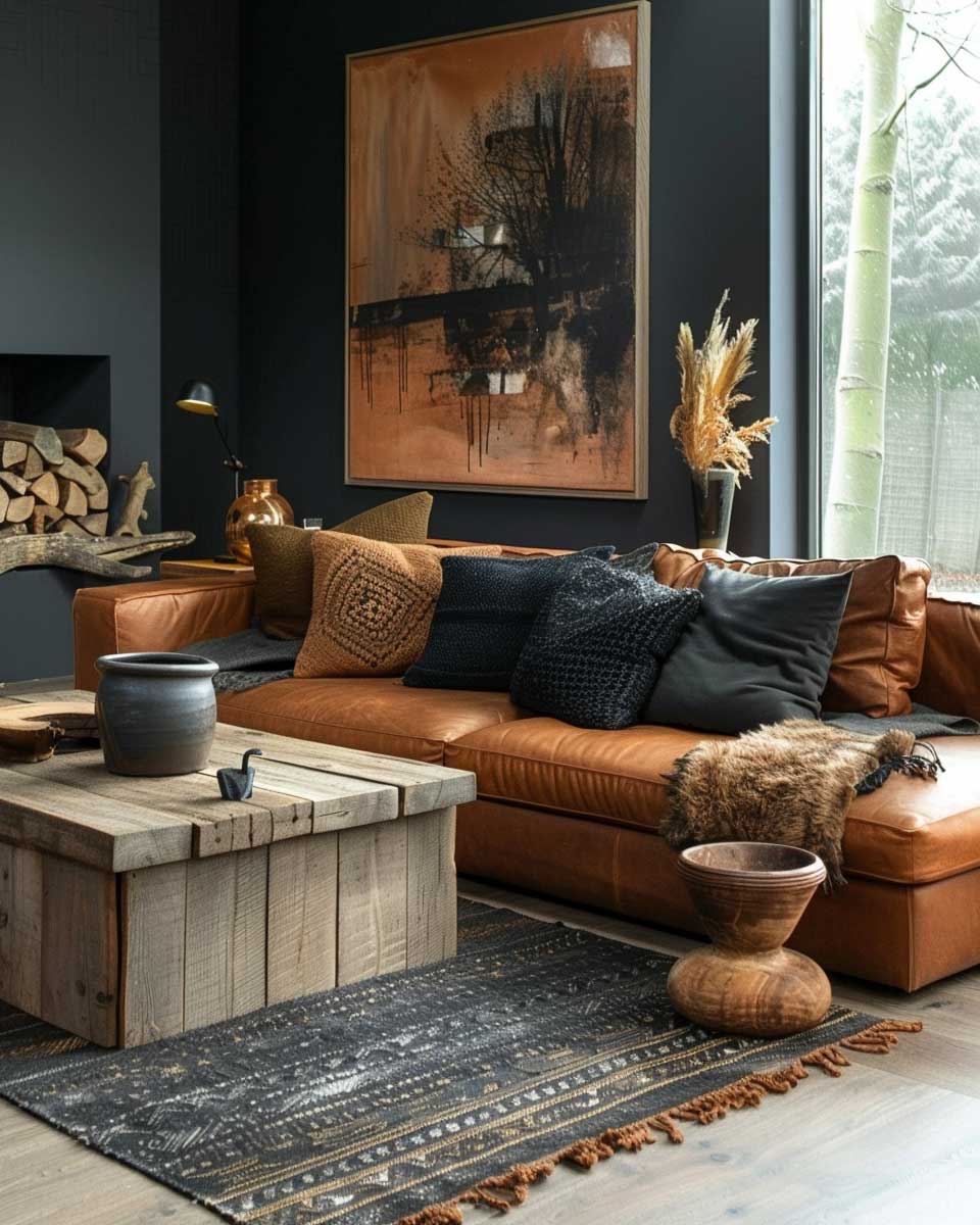 Furniture selections in this living room lean towards the robust and earthy, with materials like reclaimed wood and distressed leather taking center stage. A sturdy coffee table, its wood grain visible and rich, might feature bronze metal legs or inlays, marrying the rustic feel of the timber with the industrial edge of the metal. Similarly, a leather sofa, worn to a softness that invites relaxation, is adorned with bronze-studded detailing, echoing the urban meets rustic theme.