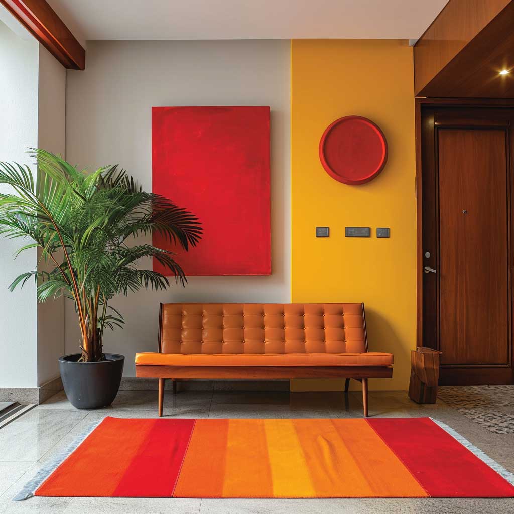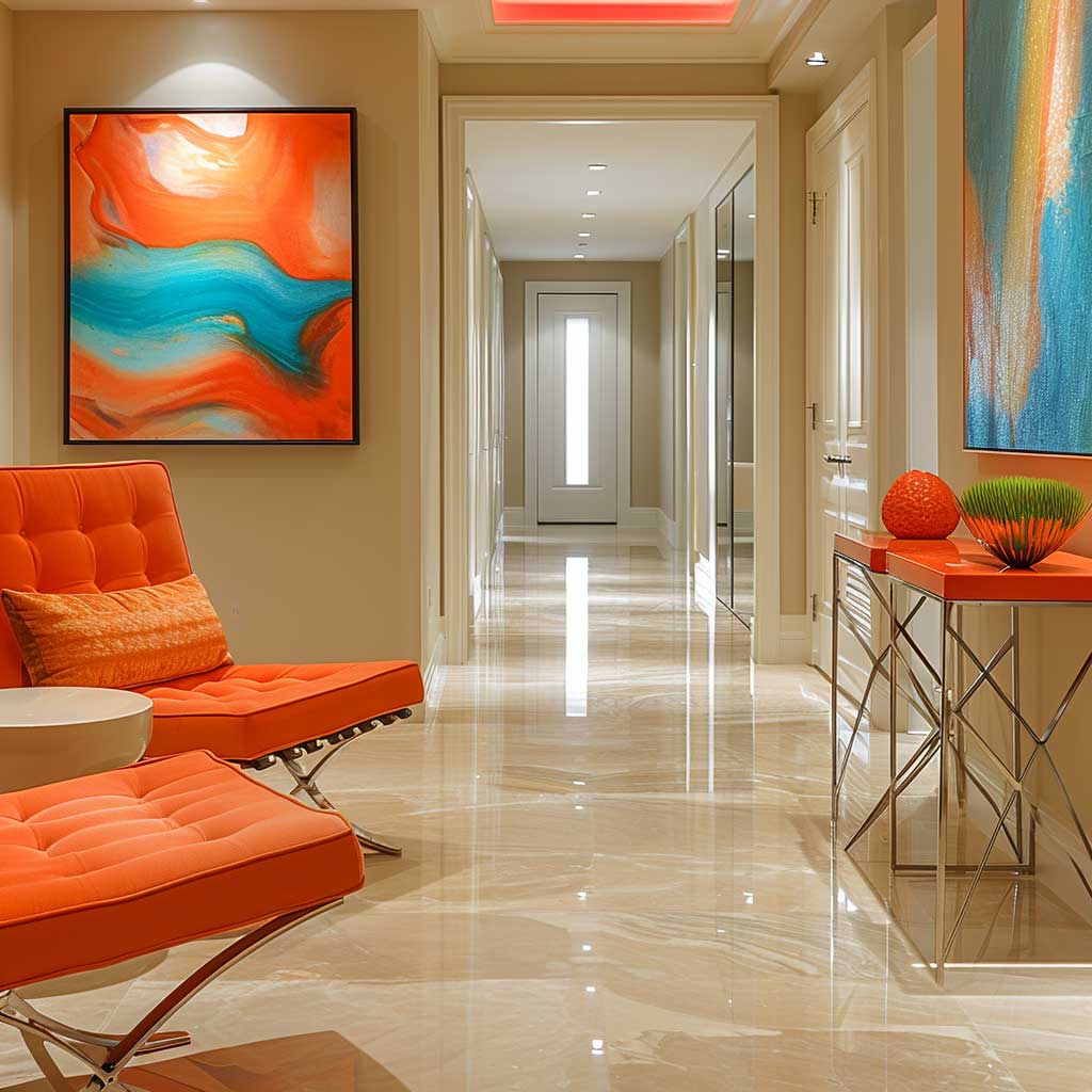A hall designed with a blend of classic elegance and modern pop is a testament to the harmonious coexistence of different design styles. It offers a welcoming entrance that is both refined and contemporary, reflecting a sophisticated yet bold approach to interior design.