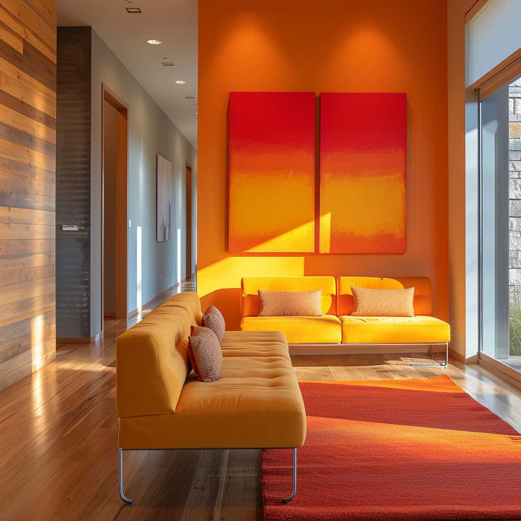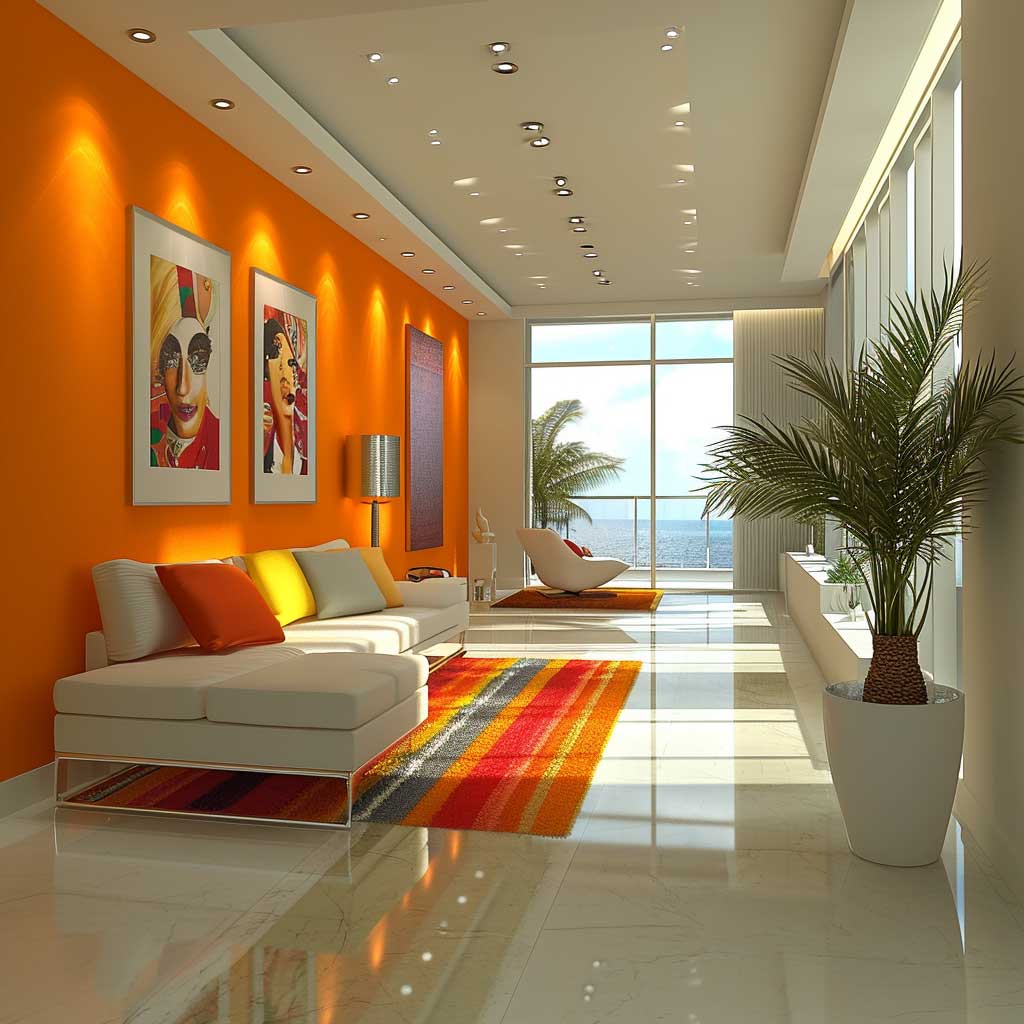 In a vibrant minimalist design, the hall becomes a canvas for expression through carefully chosen colors and shapes. The overall color scheme is typically neutral, providing a clean and uncluttered backdrop. Against this backdrop, vibrant colors are introduced in a controlled manner. This could be through a brightly colored piece of art, a vividly patterned rug, or a statement piece of furniture. The idea is to use these pops of color to draw the eye and add interest without cluttering the space.