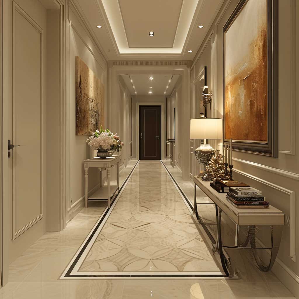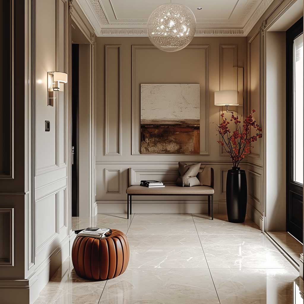 Textures and materials play an important role in this style of hall design. Rich woods, luxurious fabrics, and ornate details characteristic of classic design can be complemented with modern materials like glass, metal, or acrylic. The combination of different textures adds depth and interest to the space.