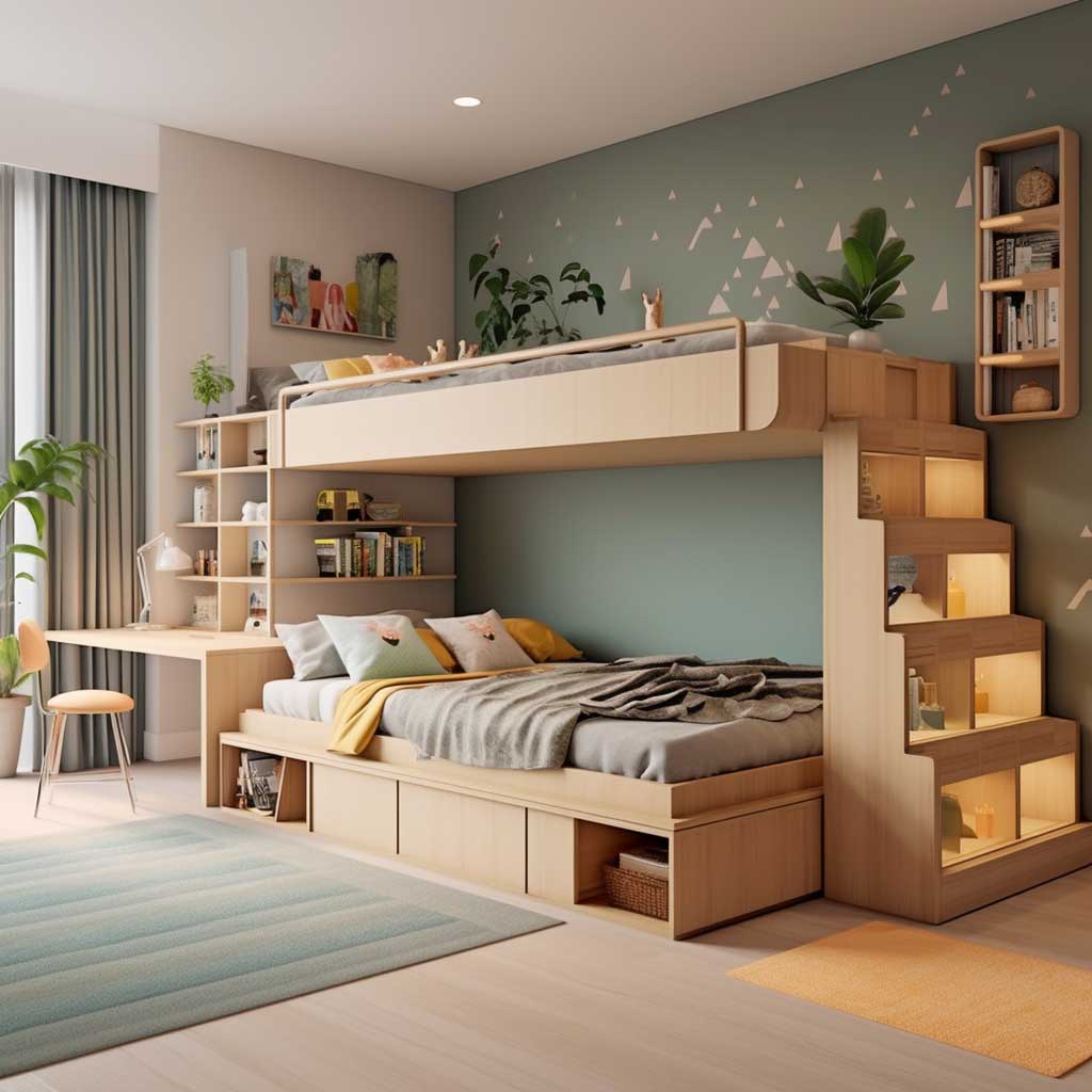 In a multifunctional children’s bedroom, the bed often becomes the central feature. Options like loft beds with integrated desks or daybeds with pull-out storage drawers provide multiple functions within a single piece of furniture, maximizing the use of space.