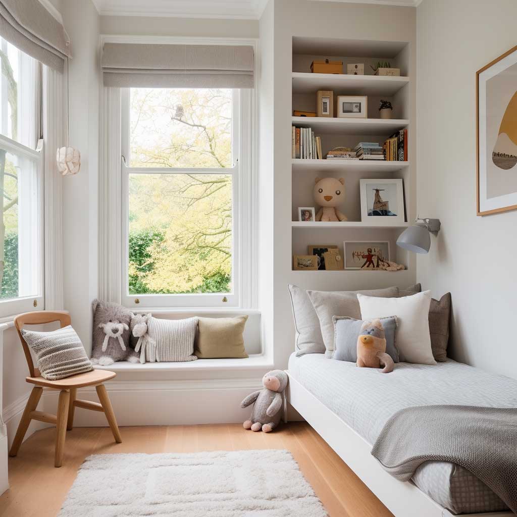 Effective storage solutions are vital in children’s bedroom designs for small rooms. Wall-mounted shelves, under-bed storage, and multi-purpose units can keep belongings neatly organized. Seating options like ottomans with storage or benches with built-in shelving can add functionality without occupying extra space.