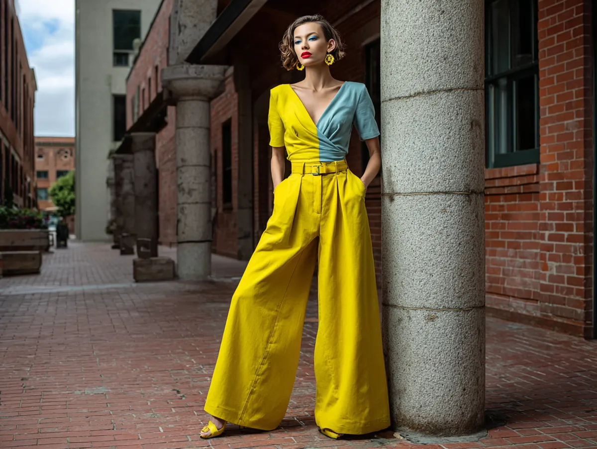Vivid color blocking is for those who view clothing as expression rather than utility. Wide leg jeans, with their sculptural proportions, offer the perfect stage for such bold experimentation. Bright coral against navy, lemon paired with espresso brown, turquoise meeting crimson — each combination reinvents the perception of denim.