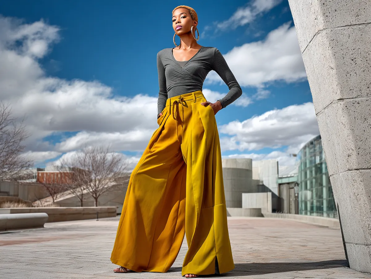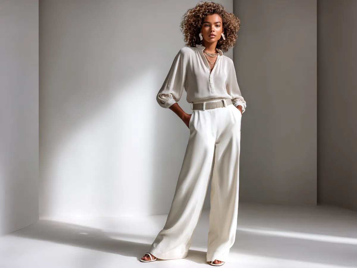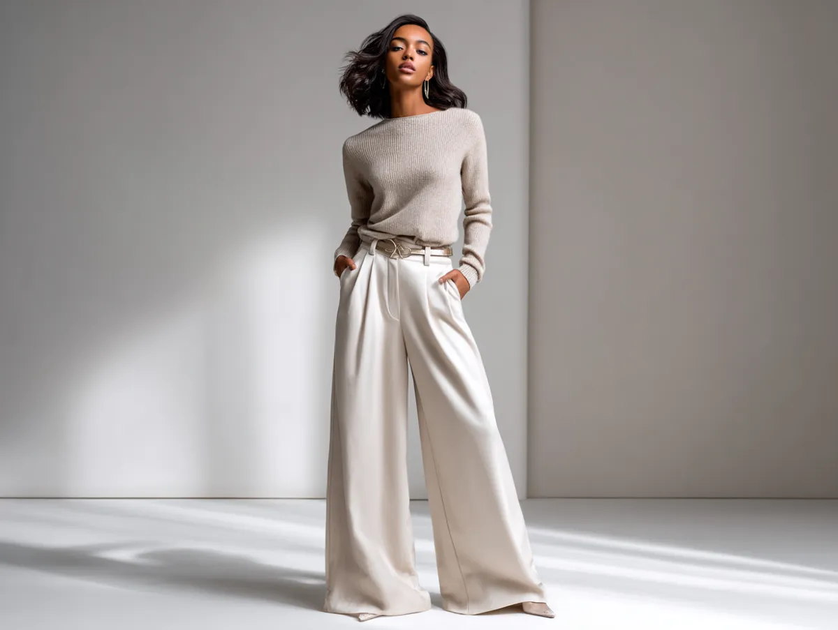 Every element is purposeful. Tailoring defines the silhouette, while fabric movement introduces poetry. The wide leg cut offers architectural grace, turning even the most pared-down combination into a study of proportion. Accessories are minimal: perhaps a slim watch, a soft leather clutch, or suede mules. Each piece adds texture, not distraction.
