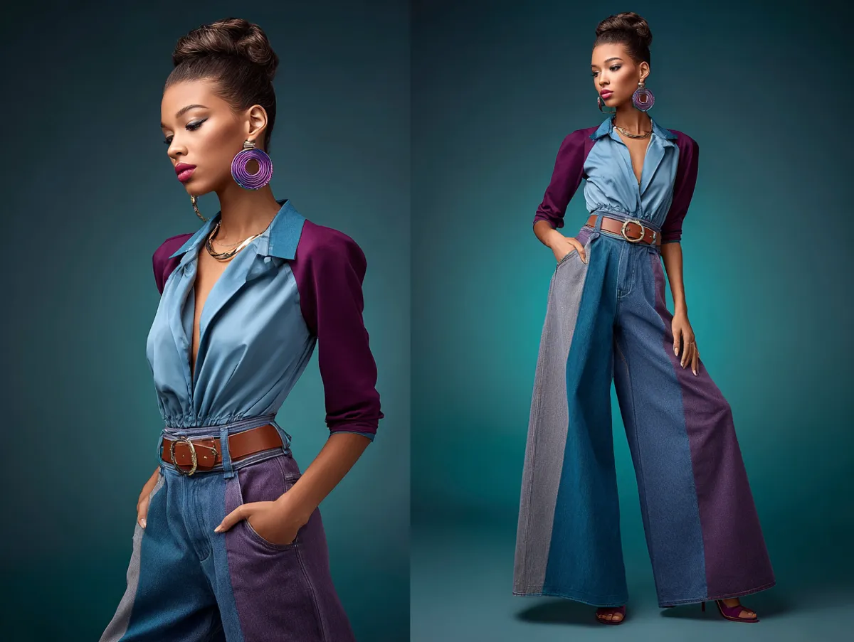 The balance begins with texture. Wide leg jeans, often in deep indigo or soft cobalt, serve as the grounding element in the ensemble. Their structured drape allows vibrant upper pieces to flourish. Imagine the gleam of a silk blouse in garnet or the matte subtlety of a velvet jacket in teal; together, these hues converse through contrast. This interplay of weight and sheen defines the essence of color blocking — the meeting of intensity and calm.