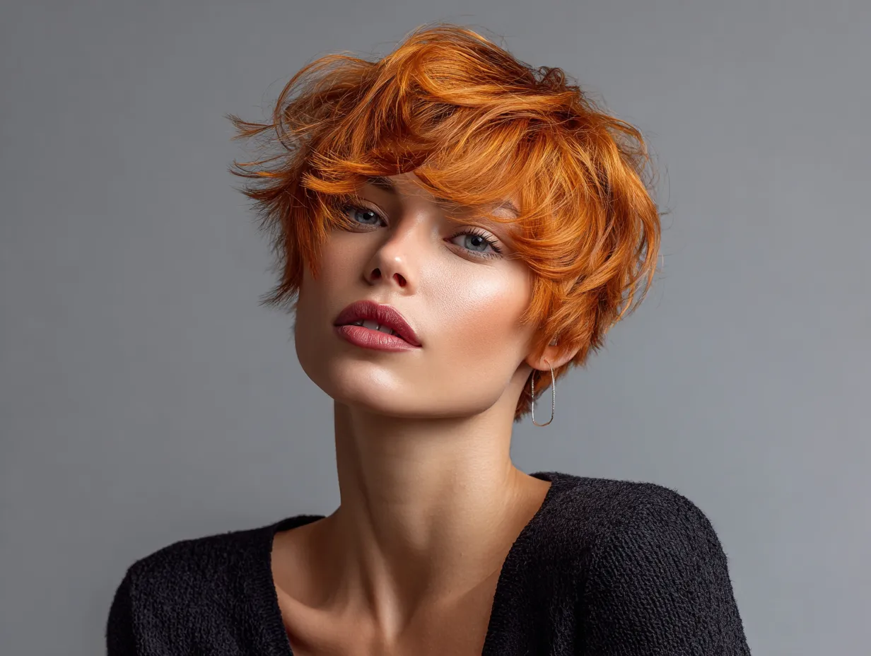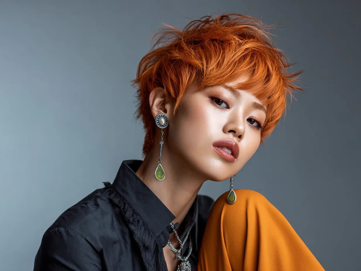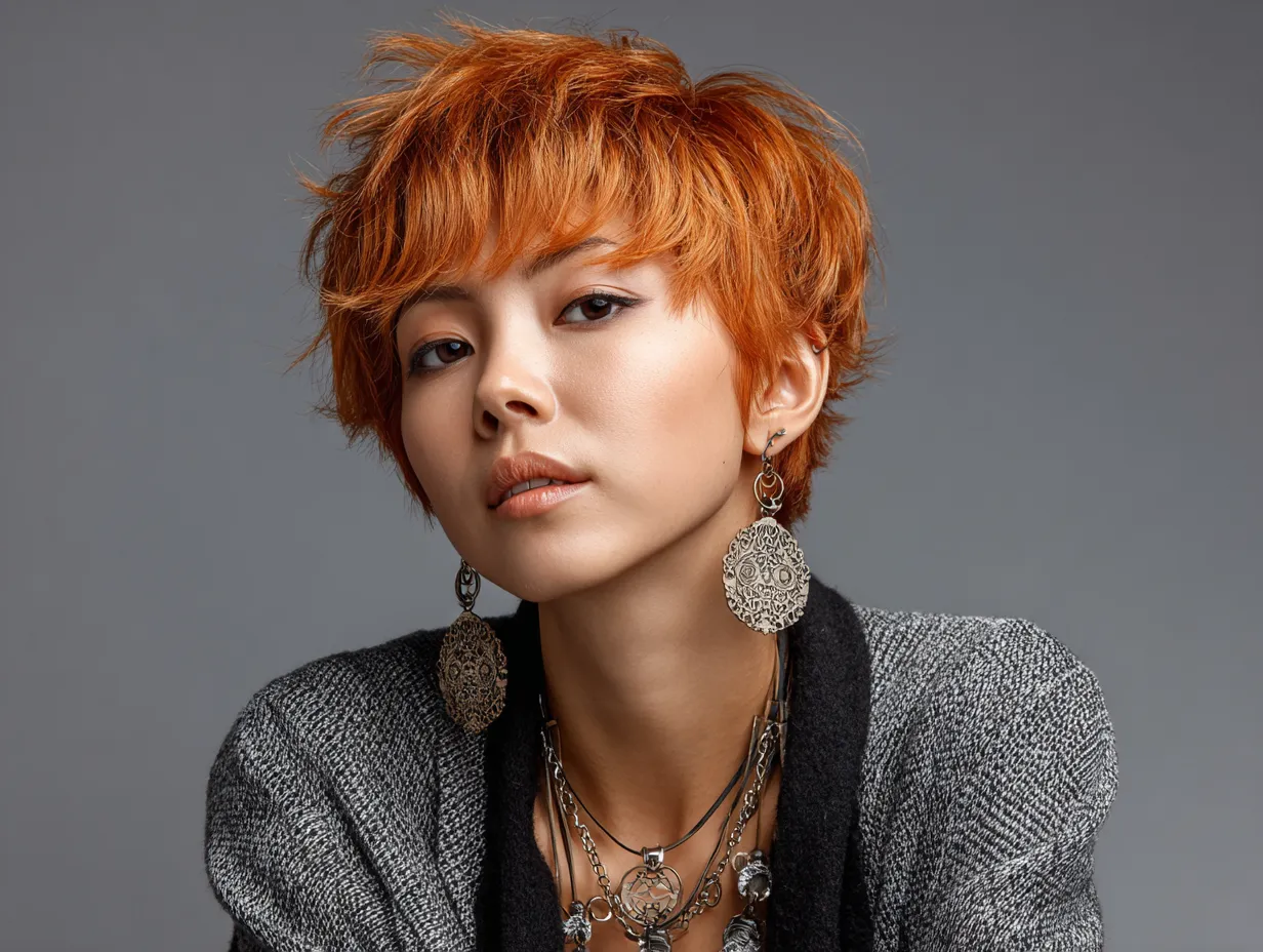 A shaggy pixie in burnt tangerine delivers an electric jolt of energy while staying grounded in Japanese precision. This version of the pixie thrives on asymmetry and organic flow, favoring slightly longer layers around the crown and bangs while tapering the sides and back. The result is dynamic and slightly wild — but always under control.