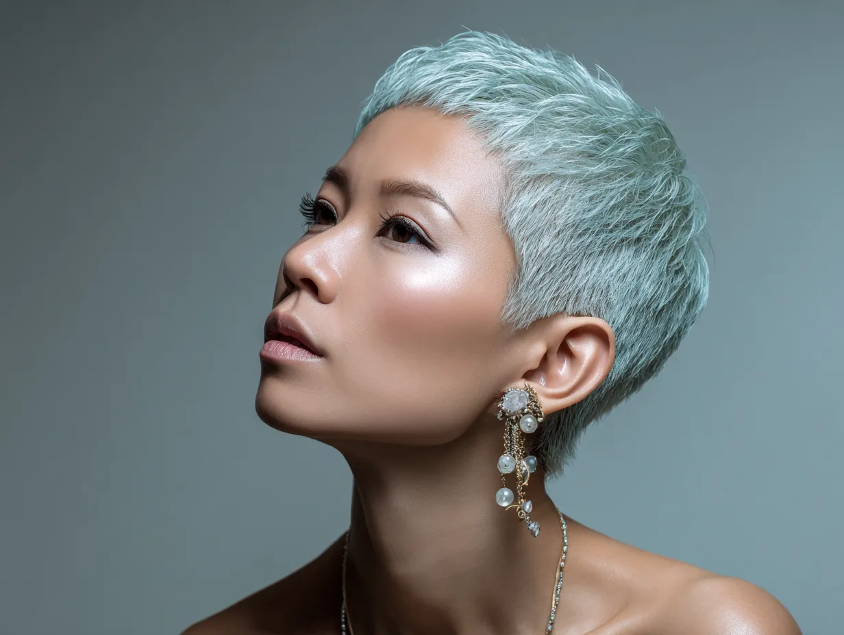 Silver mint is a cool, fresh hue with undertones of metallic sheen and soft green. It’s unusual without being theatrical, offering a quiet visual spark that works well with minimalist fashion and muted color palettes. In Japan, muted pastels are often associated with subtle rebellion — not loud enough to demand attention, but intriguing enough to hold it. This color choice turns the micro pixie into an artful conversation between haircut and hue.