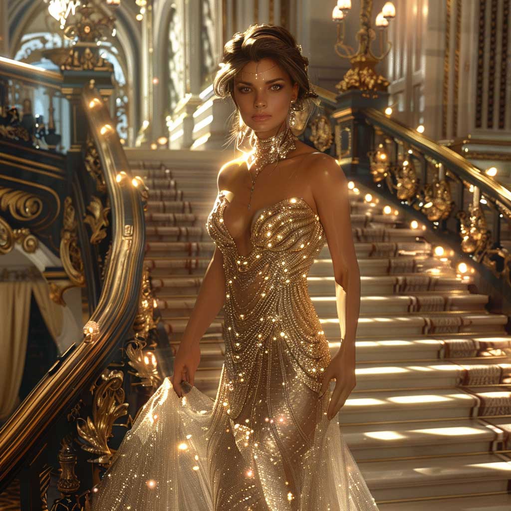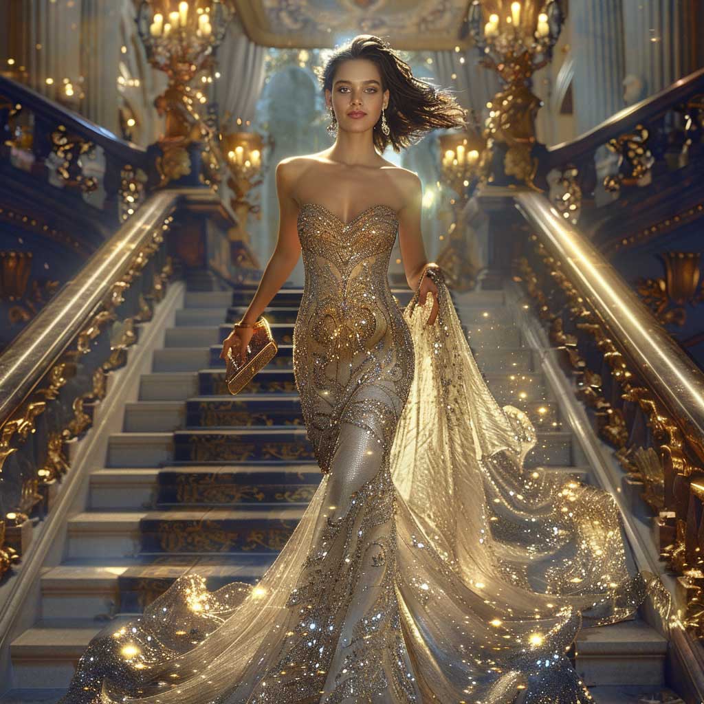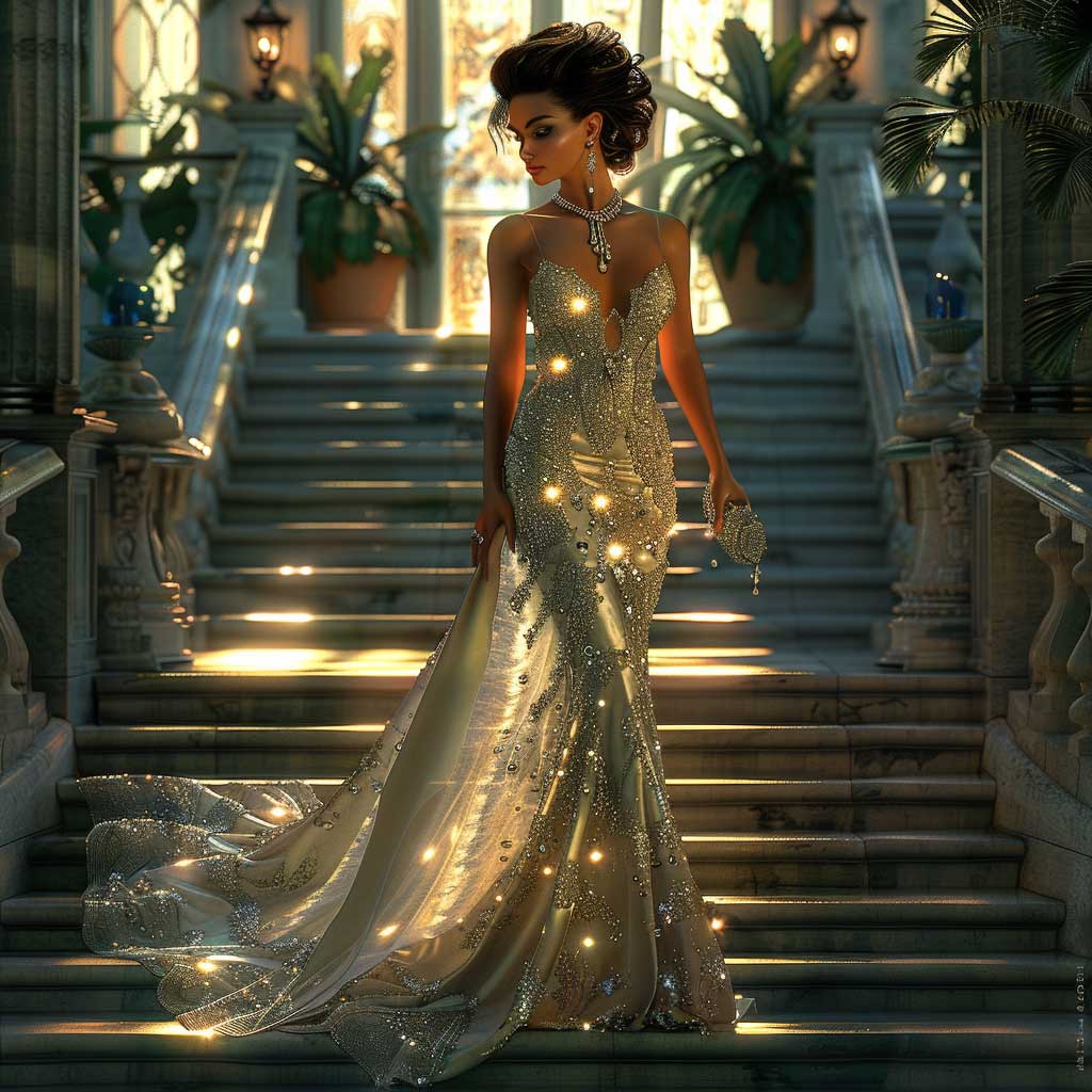 As day transitions into night, the fashion narrative evolves to embrace the glamour and mystery of evening wear. In this vignette, a model makes a grand entrance, descending a staircase as twilight envelopes the surroundings. She is the embodiment of nighttime elegance, wearing a gown that captures the essence of sophistication and allure.