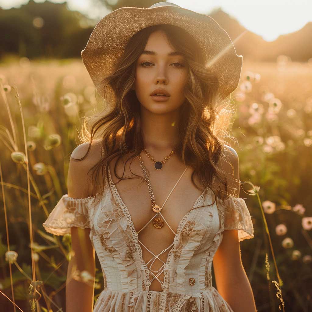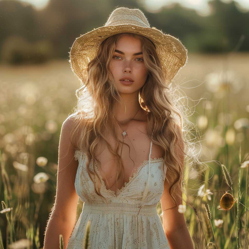 Imagine a fashion model, embodying the spirit of summer in a picturesque meadow at golden hour. The light cascades softly over her, highlighting the gentle flow of her summer dress. This dress isn’t just a piece of clothing; it’s a statement of summer itself—light, breezy, and utterly enchanting. Accessorized with minimalist jewelry and a wide-brimmed straw hat, the outfit captures the essence of effortless elegance that summer demands.
