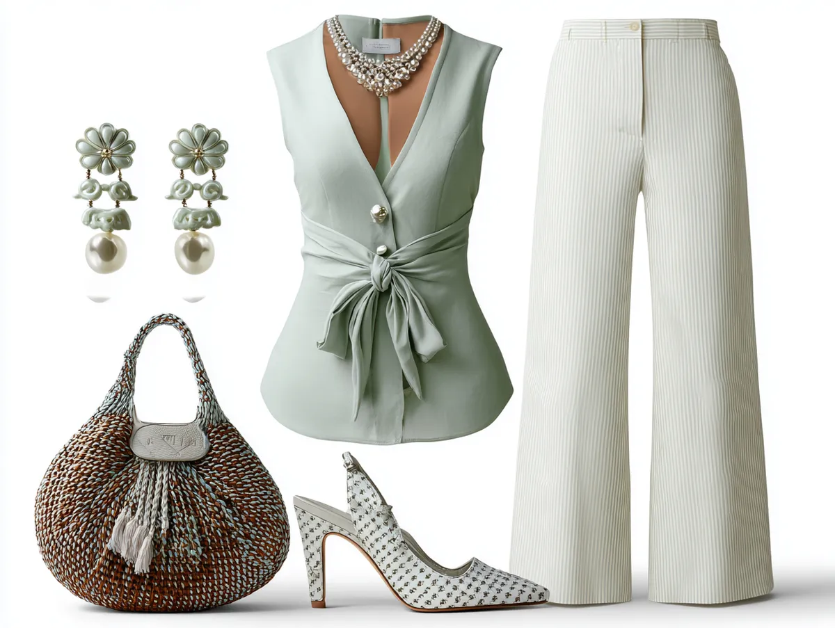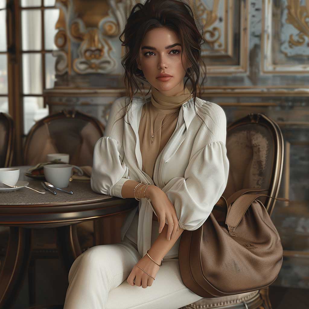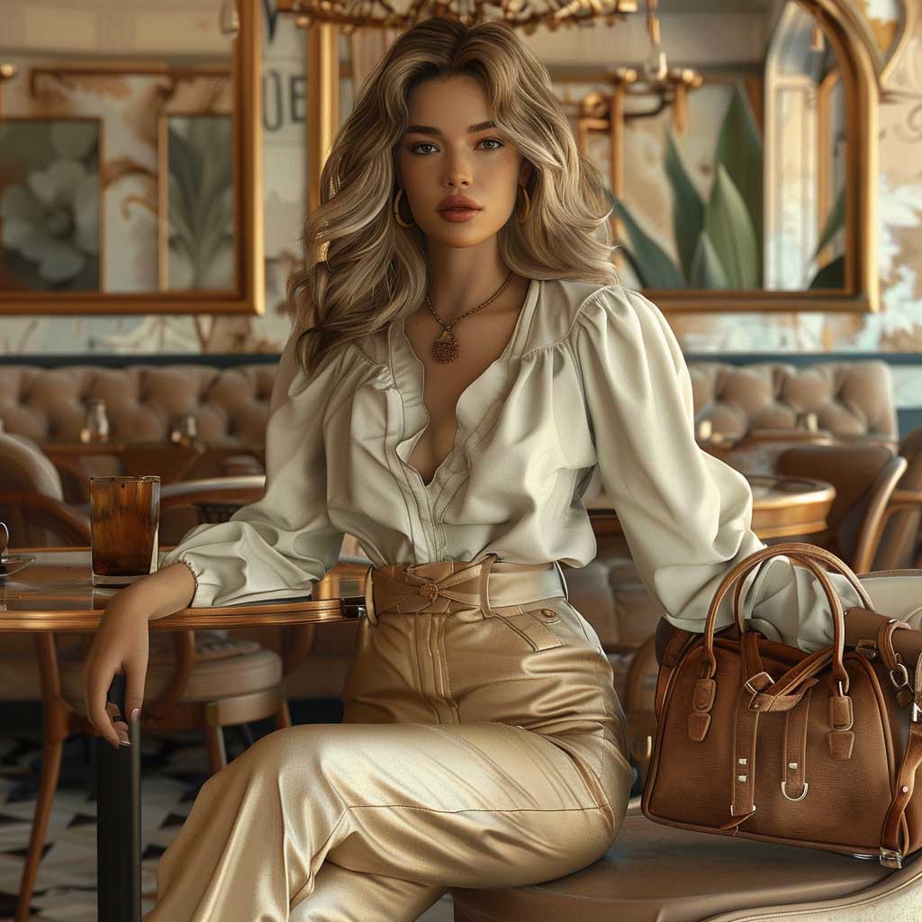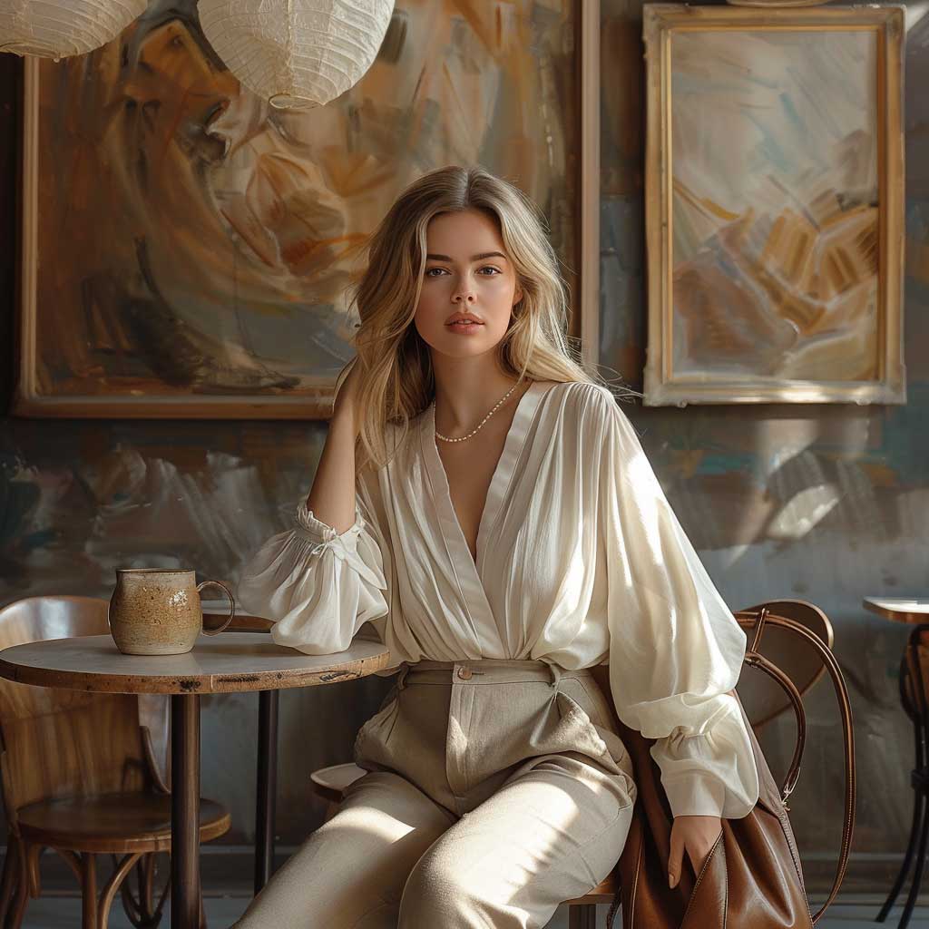 Transitioning to a setting where the hustle and bustle of city life meet the realm of fashion, chic comfort becomes the mantra. Here, the narrative shifts to a stylish cafe where a fashion model showcases an outfit that marries sophistication with comfort. This ensemble, featuring high-waisted trousers paired with a soft, draped blouse, redefines workplace attire with a nod to leisure.