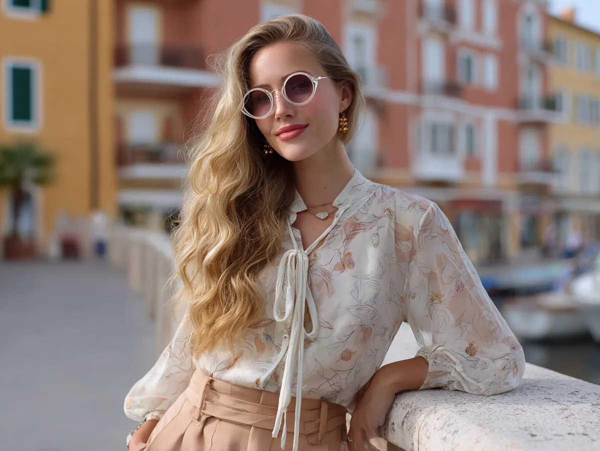 The choice of a loose, flowy dress echoes the desire for freedom and ease, mirroring the laid-back vibe of the season. The incorporation of vintage sunglasses adds a touch of nostalgia, a nod to the timeless appeal of summer fashion. It’s a look that speaks to those leisurely walks on the beach, picnics under the sky, and evenings spent watching the sunset.