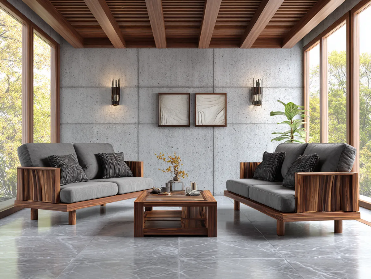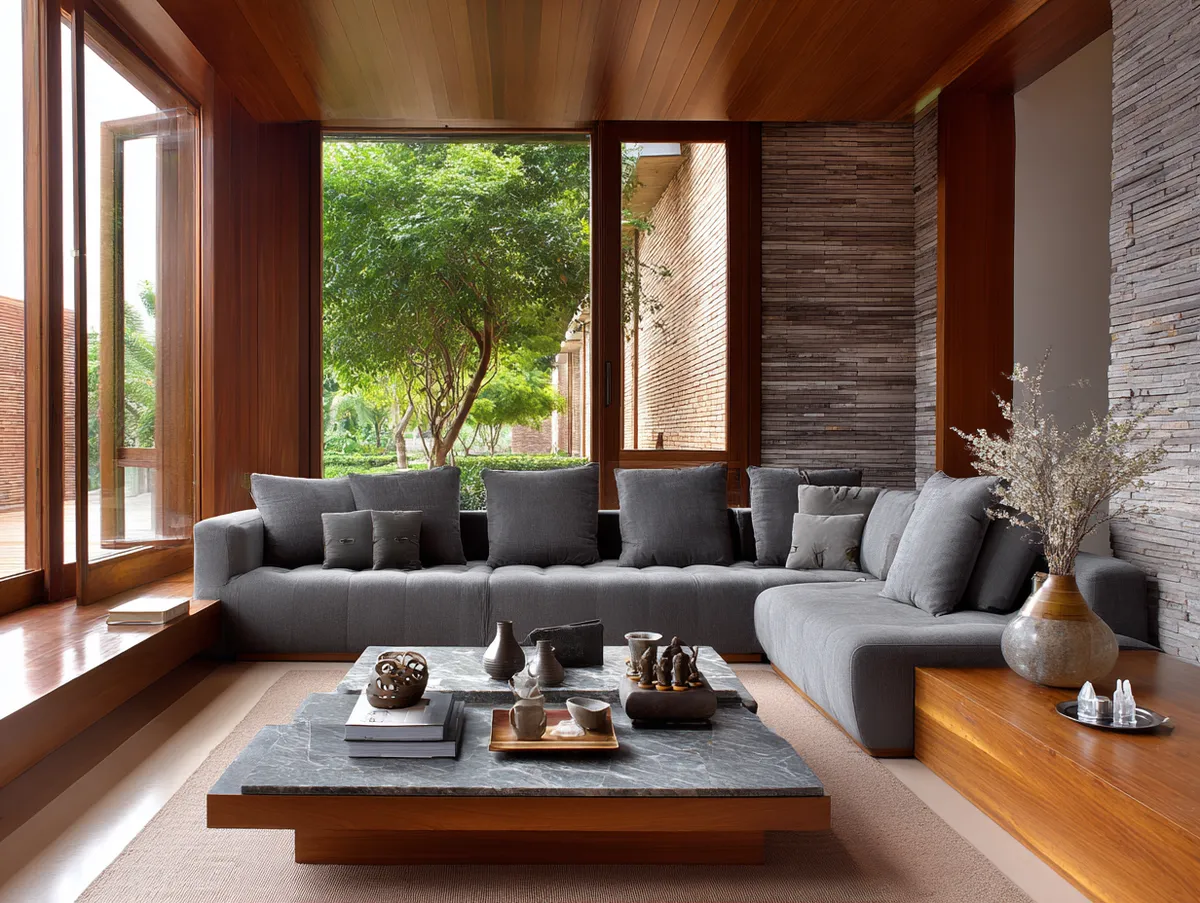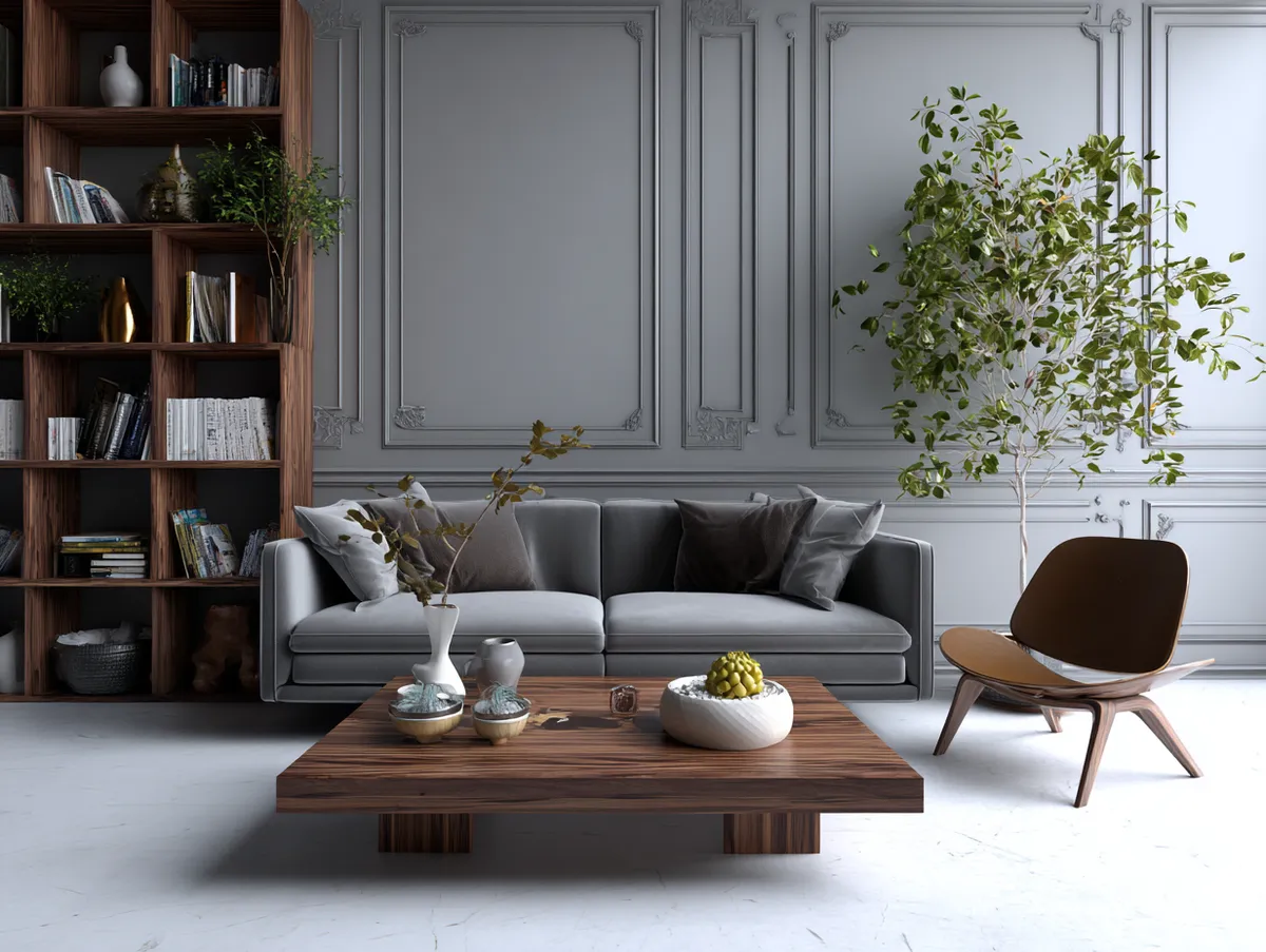 To create a tranquil escape, use a soft, "misty" shade of grey for the walls to establish a calm, cloud-like atmosphere. Pair this with rich, deep brown wooden accents—reminiscent of coffee or tree bark—to anchor the room and add warmth. A plush grey sofa serves as the central comfort piece, while a brown wooden coffee table with traditional carvings introduces a sense of craftsmanship and tradition. This balance between the ethereal grey and the grounded brown creates a sophisticated sanctuary that feels shielded from the fast pace of urban life.