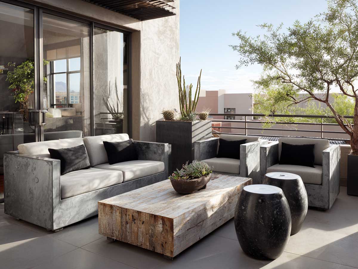 The furniture here is sculpted from cast concrete or concrete-look resin, often paired with minimal steel frames. Rectangular blocky armchairs, linear benches, and geometric coffee tables keep everything grounded. Their gray tones reflect subtle shades of urban light, from overcast skies to city glows at night. When paired with black or metallic accents—like a matte firepit or steel planter boxes—the result is a visually cohesive setup that exudes strength and quiet confidence.