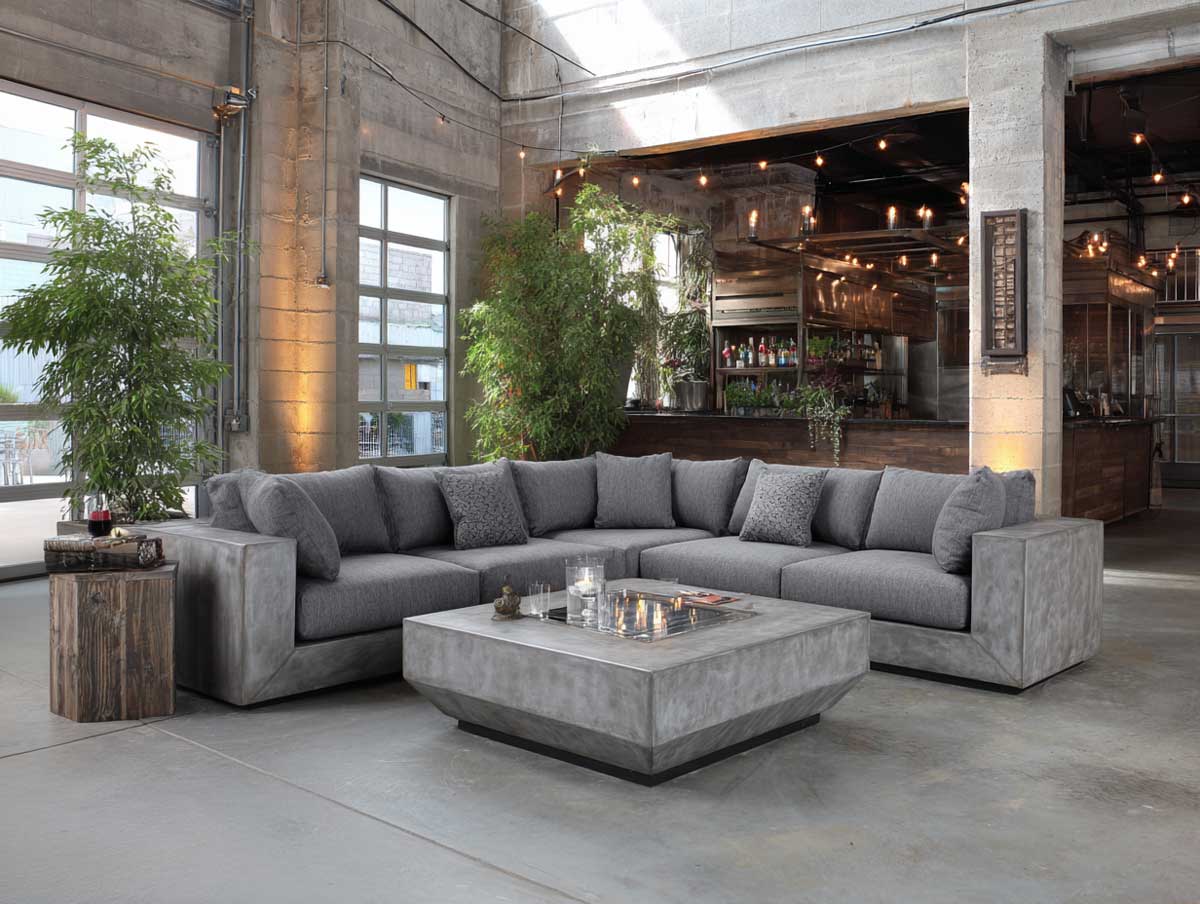 One of the most iconic expressions of industrial design is the rooftop loft patio, where raw architectural elements frame the outdoor experience. In this context, concrete gray furniture becomes more than just seating—it defines the mood and language of the entire space. On a rooftop surrounded by exposed brick, weathered steel beams, and glass barriers, every piece must be both practical and powerful in form.
