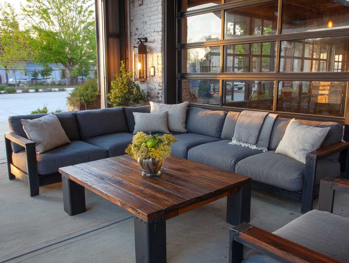 When industrial sensibility meets reclaimed materials, the result is a hybrid style rich in character and craftsmanship. A garden patio framed by aging wood walls, gravel underfoot, and rusted steel containers finds its ideal match in gray patio furniture made from steel and salvaged wood. Here, the narrative shifts from sleek and modern to earthy and weathered—without losing the architectural sharpness of industrial form.