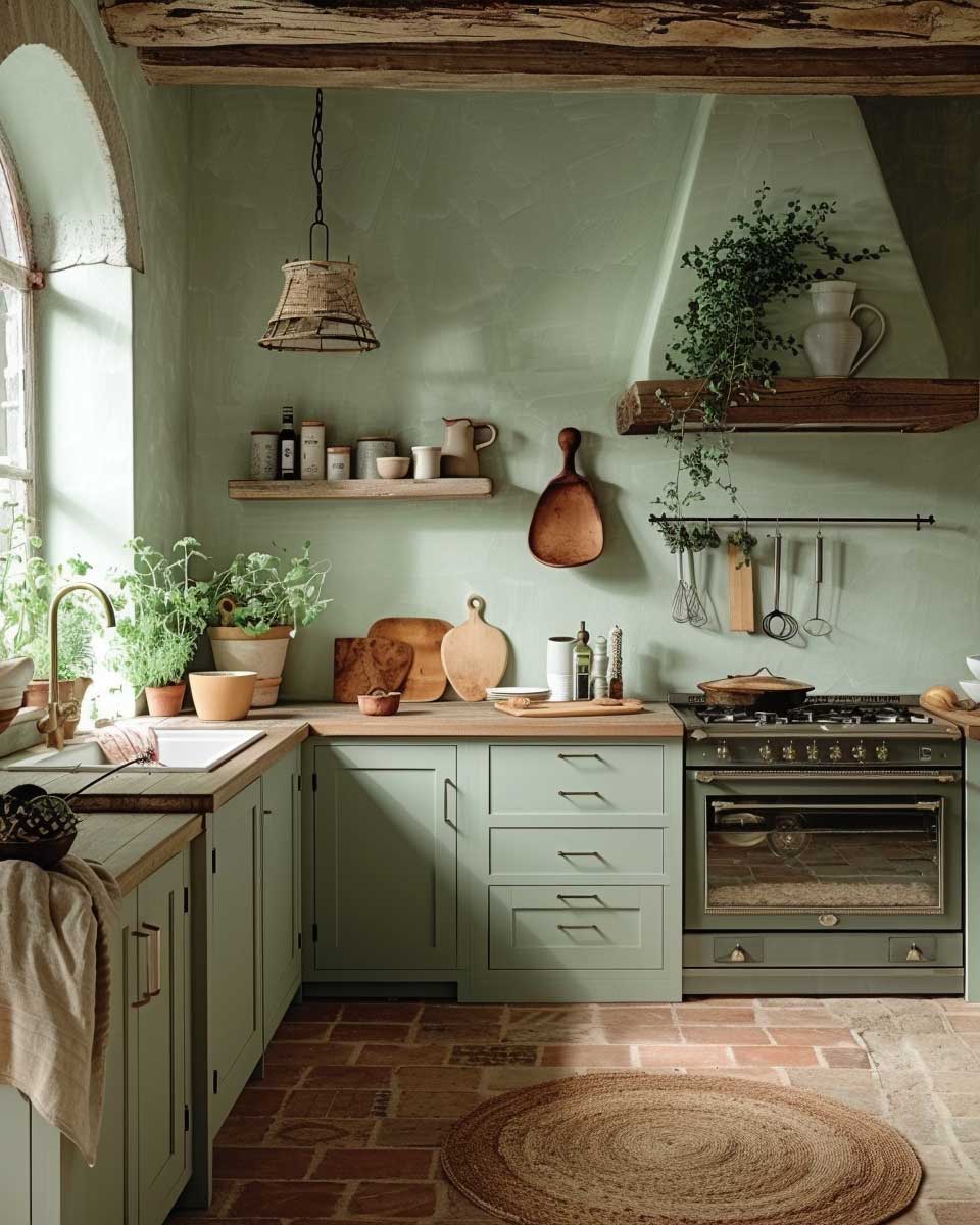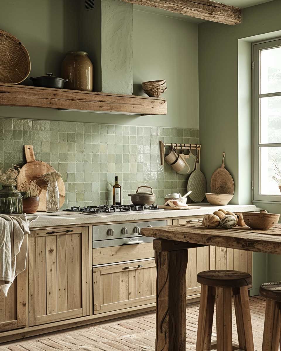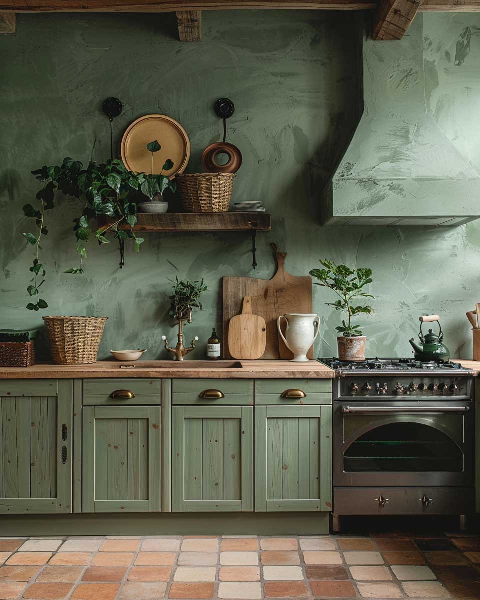 In this design vision, walls painted in soothing sage are complemented by raw wood cabinetry and terracotta tiles, crafting a space that is both inviting and grounded. The choice of green not only brings a fresh vibrancy but also harmonizes with natural materials, enhancing their inherent beauty. This combination fosters a kitchen environment that feels like a gathering place, infused with life and warmth.