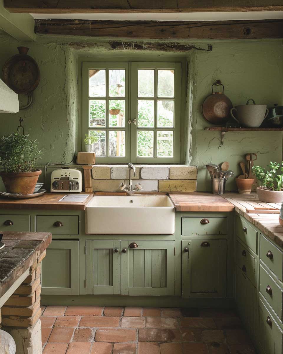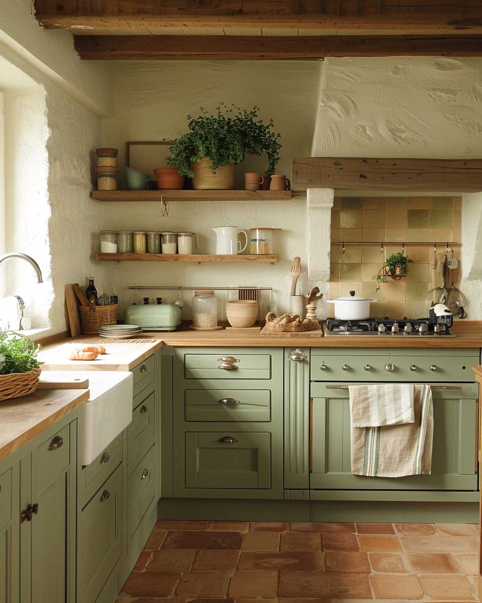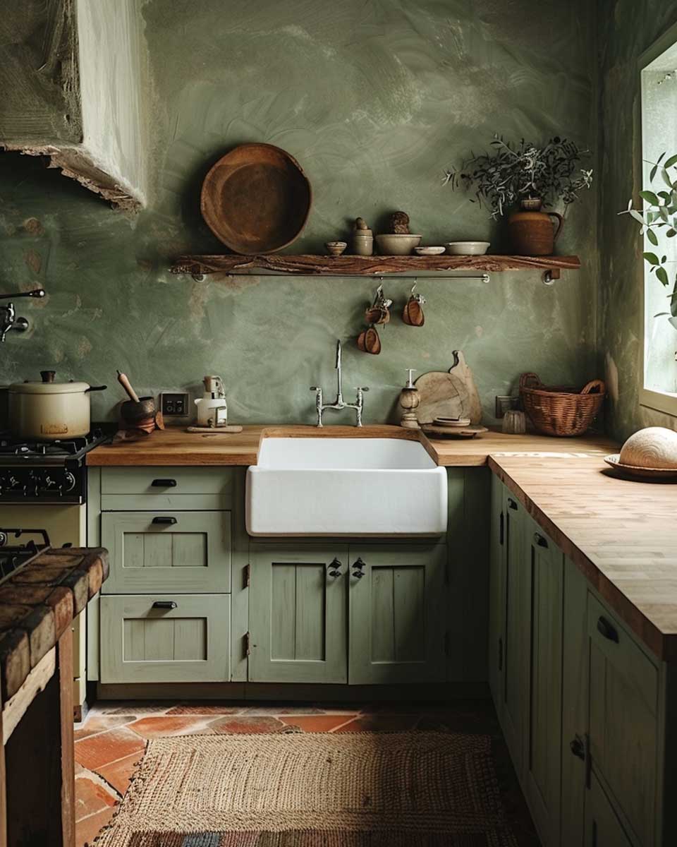 In this design vision, walls painted in soothing sage are complemented by raw wood cabinetry and terracotta tiles, crafting a space that is both inviting and grounded. The choice of green not only brings a fresh vibrancy but also harmonizes with natural materials, enhancing their inherent beauty. This combination fosters a kitchen environment that feels like a gathering place, infused with life and warmth.