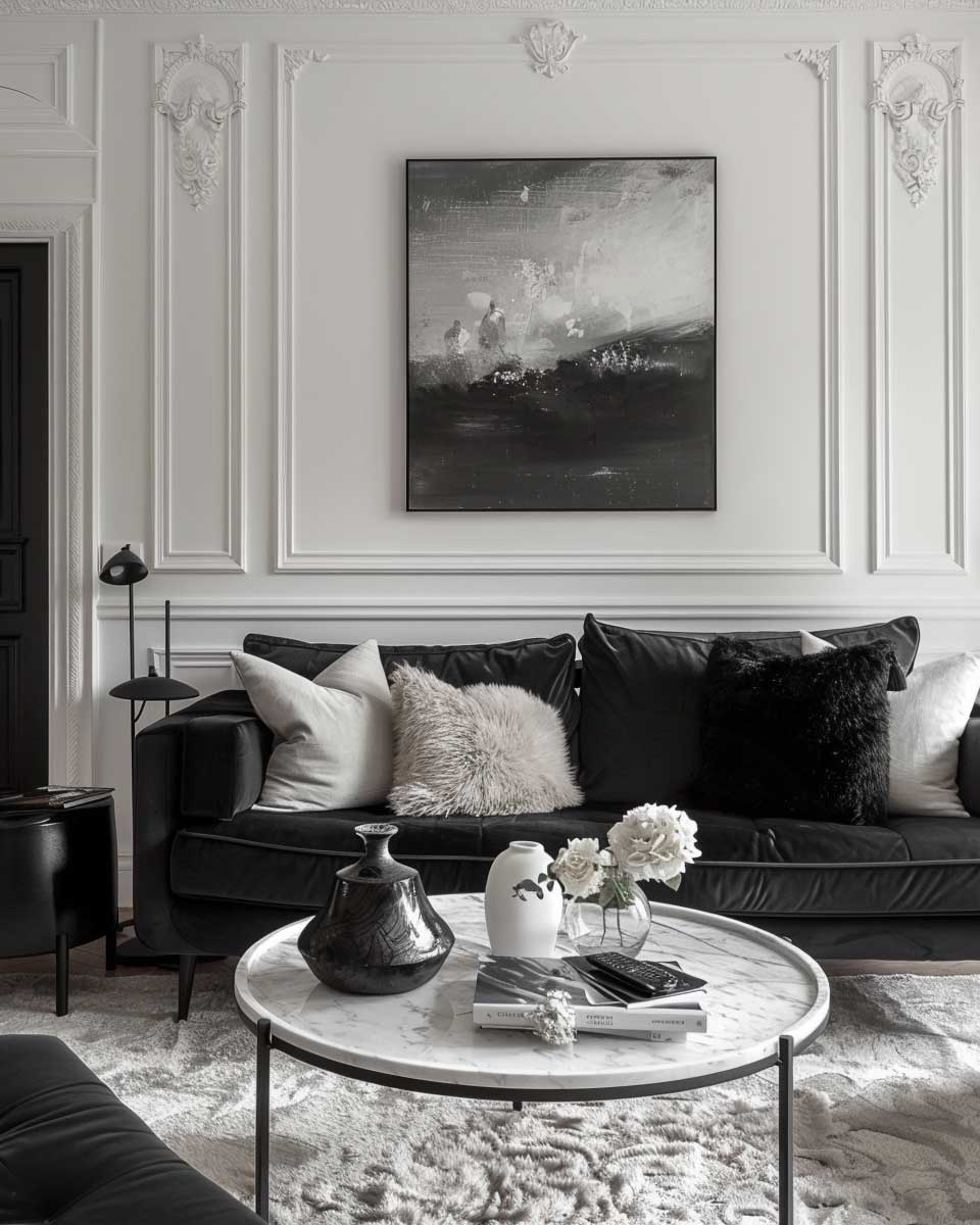 In a living room setting, the crisp white walls serve as a canvas, amplifying natural light and providing a sense of expansiveness. Black accents, whether in the form of furniture, art, or decorative items, punctuate the space with strength and clarity. This contrast not only adds visual interest but also imbues the room with a structured and polished look. The beauty of a black and white interior painting design lies in its simplicity and the powerful statement it makes.